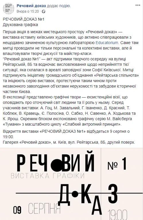 Раніше члени мистецького простору "Речовий доказ" активно співпрацювали Educatorium. Там художники влаштовували персональні та колективні виставки, творчі дискусії та майстер-класи.