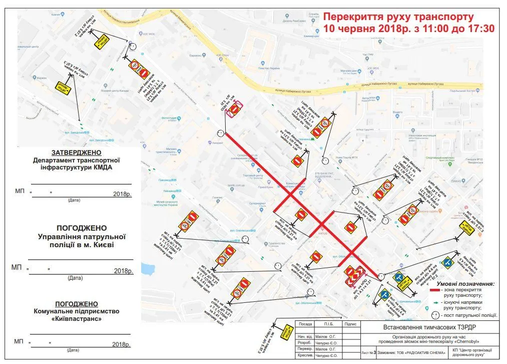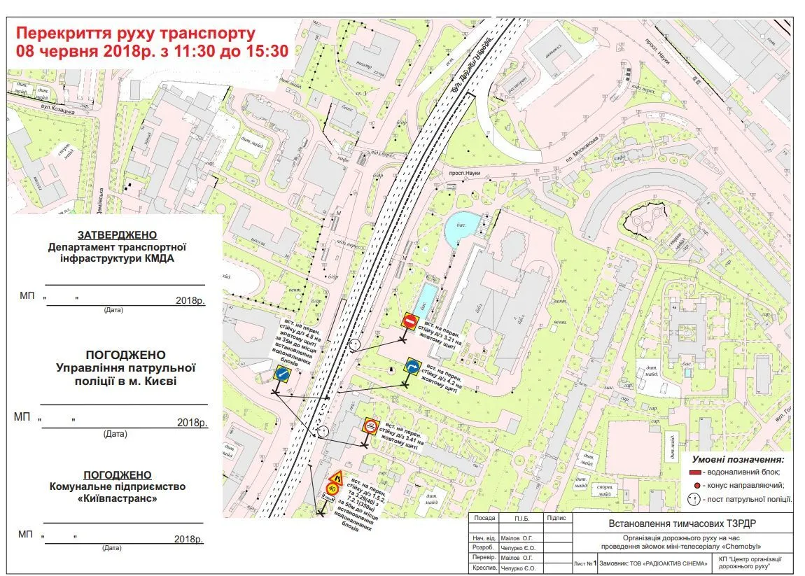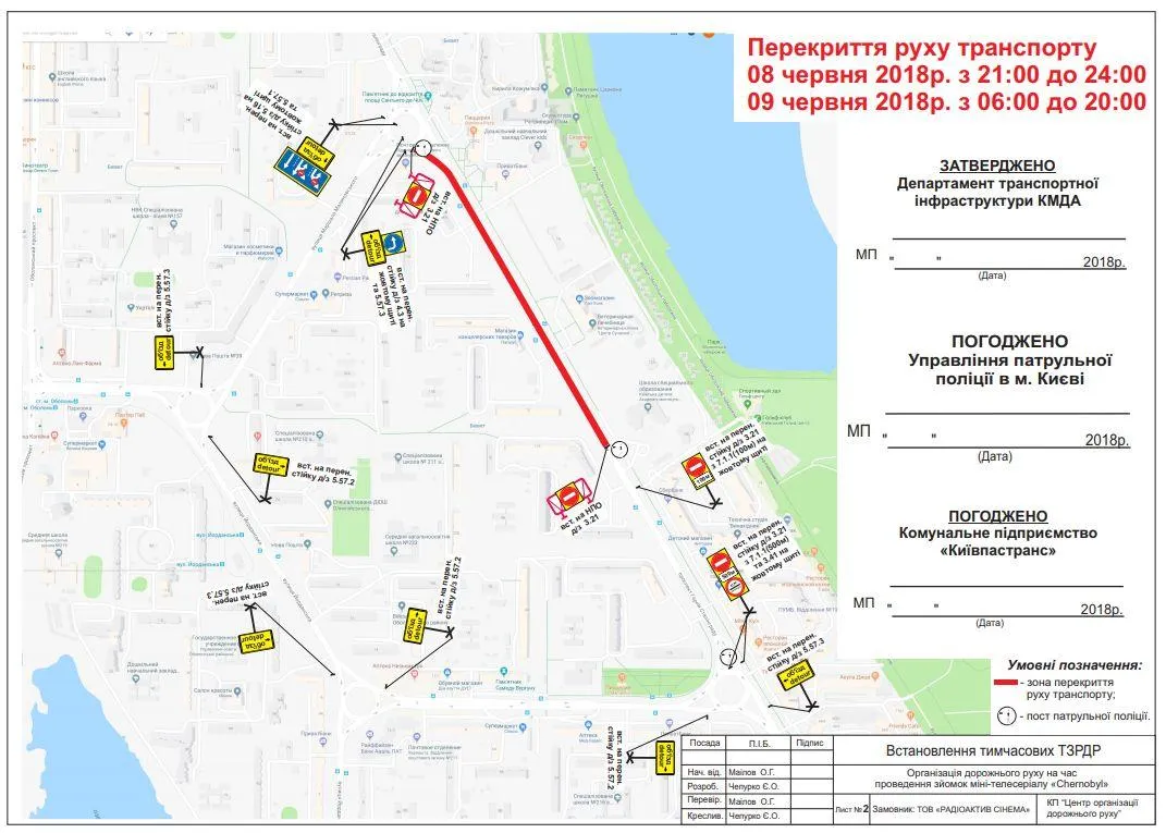 Із 8 до 10 червня на час зйомок епізодів міні-телесеріалу "Chernobyl", які проводить ТОВ "Р-Фільм", низкою вулиць буде обмежено рух транспорту. Громадський транспорт працюватиме у звичайному режимі,