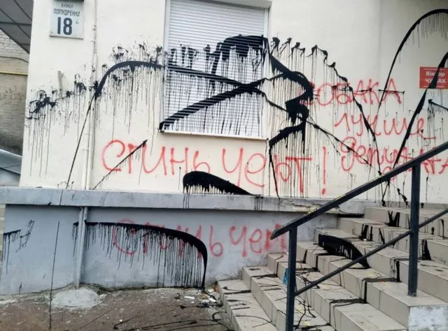 На фото видно, що вхід у приймальню розмалювали червоною та чорною фарбою і залишили кілька образливих написів на кшталт "Собака лучше депутата".