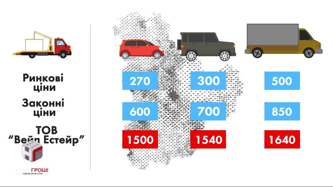 Тобто ТОВ "Вейп-Естейр" – це класична прокладка, яка не надає жодних послуг, а лише збирає гроші за тарифами, що перевищують у кілька разів і затверджені МВС, і ринкові.