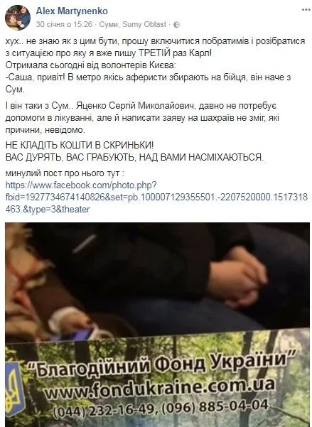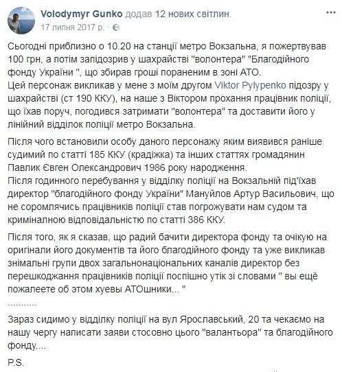 Однак поліція підтвердити ознаки шахрайської діяльності не змогла. При цьому днями Гунько днями знову зустрів представників псевдоволонтерської організації у столичному метро, які збирали кошти нібито на лікування пораненого бійця.