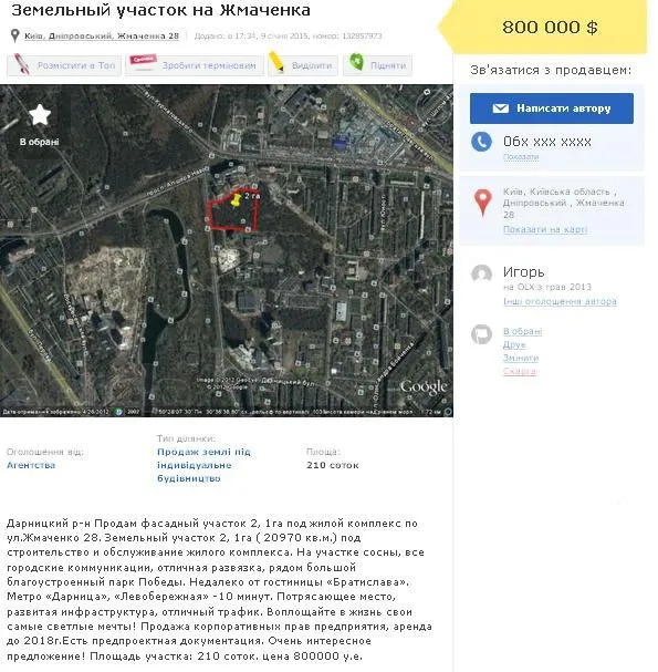 "Продам фасадну ділянку 2,1га (20970 квадратних метрів) під будівництво та обслуговування житлового комплексу. На ділянці сосни, всі міські комунікації, відмінна розв'язка, поруч великий впорядкований парк Перемоги. Недалеко від готелю “Братислава”, метро “Дарниця”, “Лівобережна” -10 хвилин. Приголомшливе місце, розвинена інфраструктура, відмінний трафік. Втілюйте в життя свої найсвітліші мрії. Продаж корпоративних прав підприємства, оренда до 2018 року. Є передпроектна документація. Дуже цікава пропозиція!" - зазначено в оголошенні.