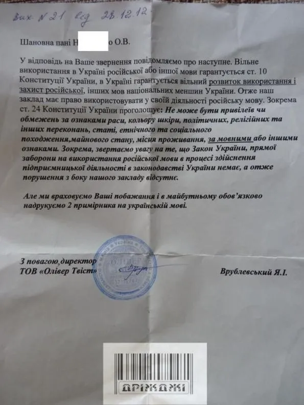 Як ідеться у відповіді, обслуговування українською може порушувати права російськомовних клієнтів. Проте, у ресторані пообіцяли випустити меню українською мовою у двох примірниках. Письмову відповідь розмістив у на своїй сторінці Facebook рух Дріжджі.