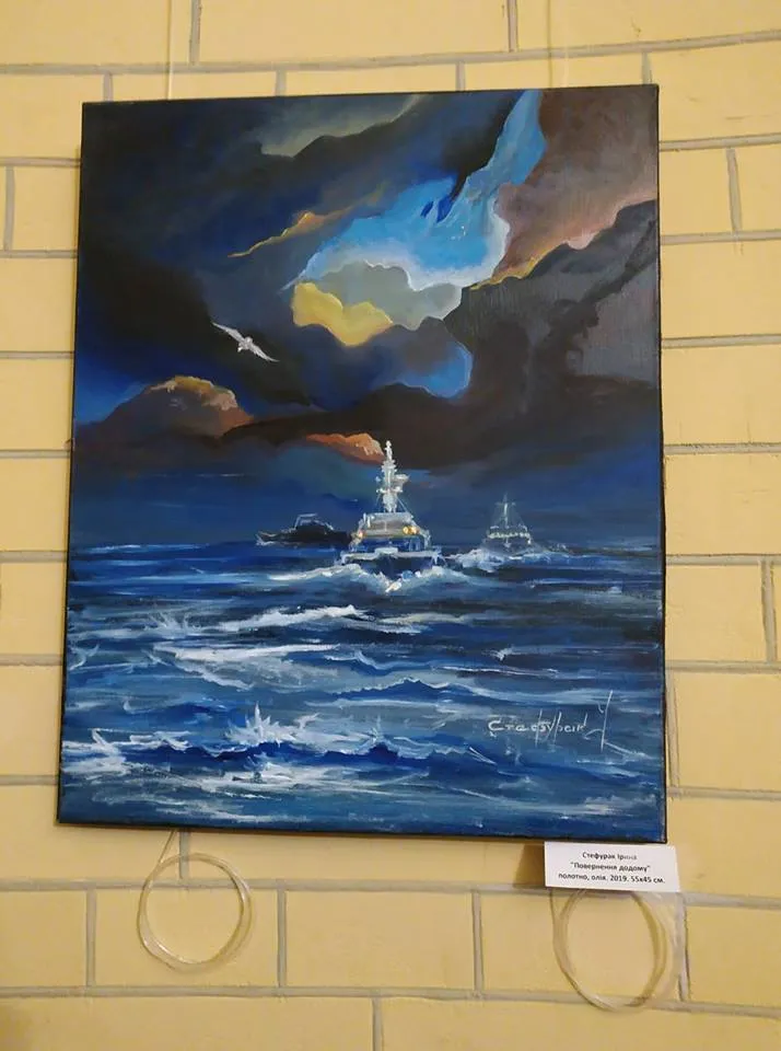 Загалом на ярмарку у Києві представили 24 картини, які присвячені поверненню додому 24 полонених моряків. На кожній з них – бурхливе море та саме ті кораблі, на яких були захоплені українці.