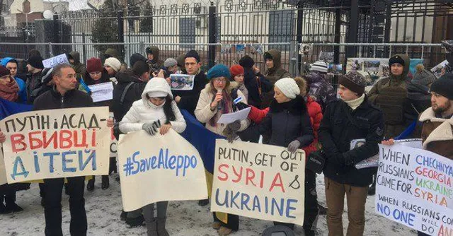 Як повідомляє "Громадське", під будівлею на Повітрофлотському проспекті зібралось близько сотні активістів, які вимагають припинити бомбардування Алеппо у Сирії.