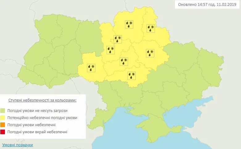 12 лютого вдень у Київській, Чернігівській, Сумській, Вінницькій, Черкаській, Кіровоградській та Полтавській областях значні опади, переважно у вигляді мокрого снігу,