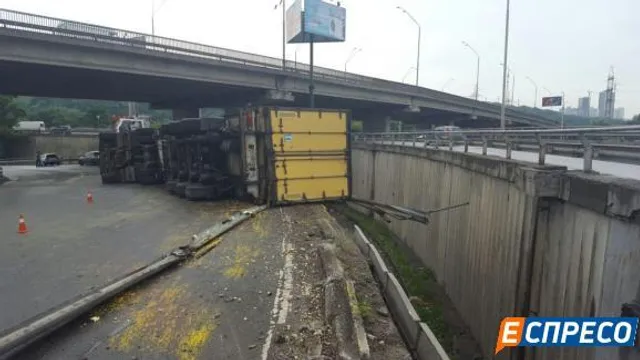 ДТП с пострадавшими в Киеве на Выдубичах: Фура опрокинулась на путепроводе. Пострадал водитель. Фото