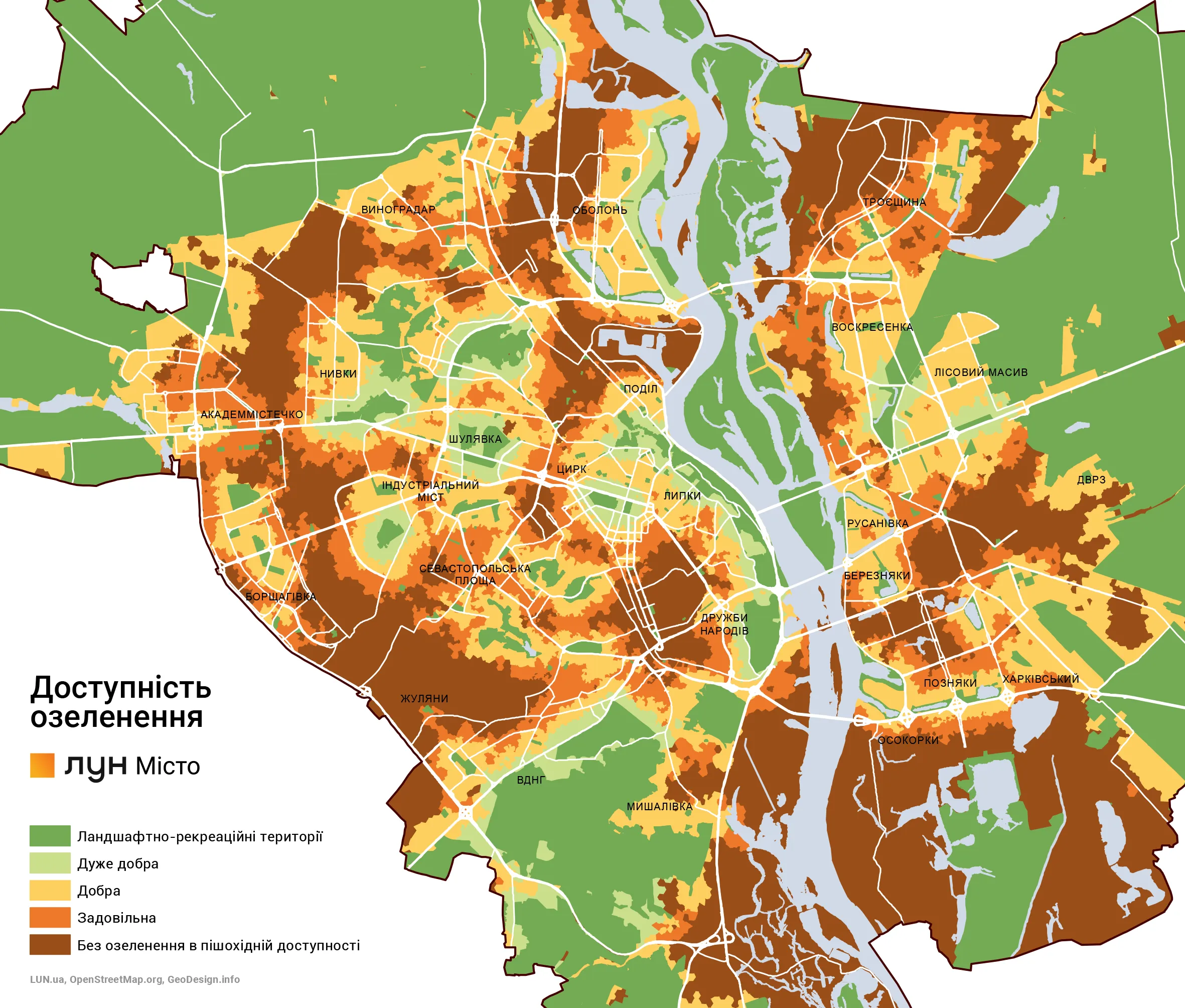 Але відповідність чи не відповідність ДБНам не завжди відповідає людському сприйняттю комфортності мікрорайону. Тож охопленість зеленими зонами аналітики оцінювали з точки зору звичайного мешканця: рахували, чи близько до парків, скверів пішки; дивились, якого вони розміру, якості.