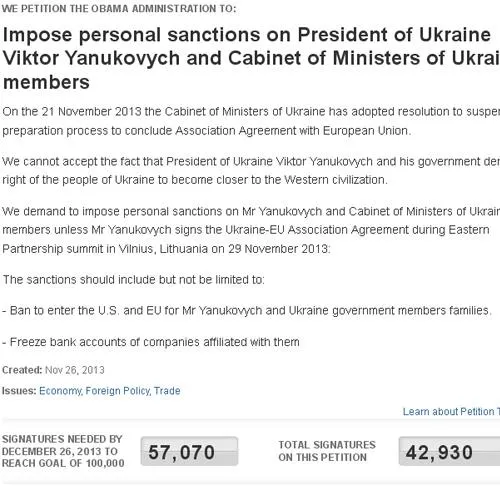 Білий дім може розглянути петицію про санкції проти Віктора Януковича та членів українського Кабміну, якщо українська влада не підпише у Вільнюсі Угоду про асоціацію з Євросоюзом.