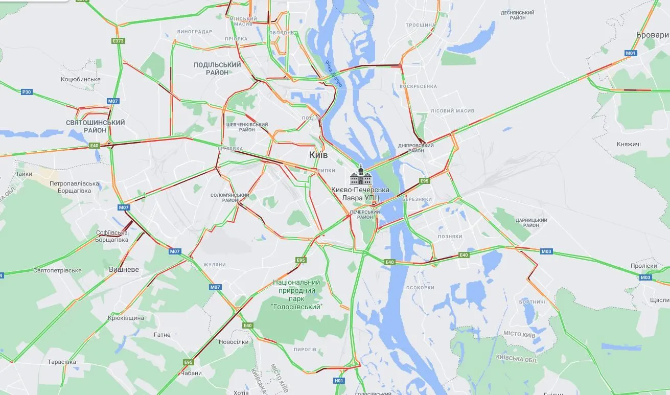 Взагалі ж затори утворилися у звичних для всіх місцях, тільки значно серйозніші, аніж зазвичай. На Правому березі важко проїхати у напрямку центру, а на Лівому – у бік мостів, свідчать дані Google maps.