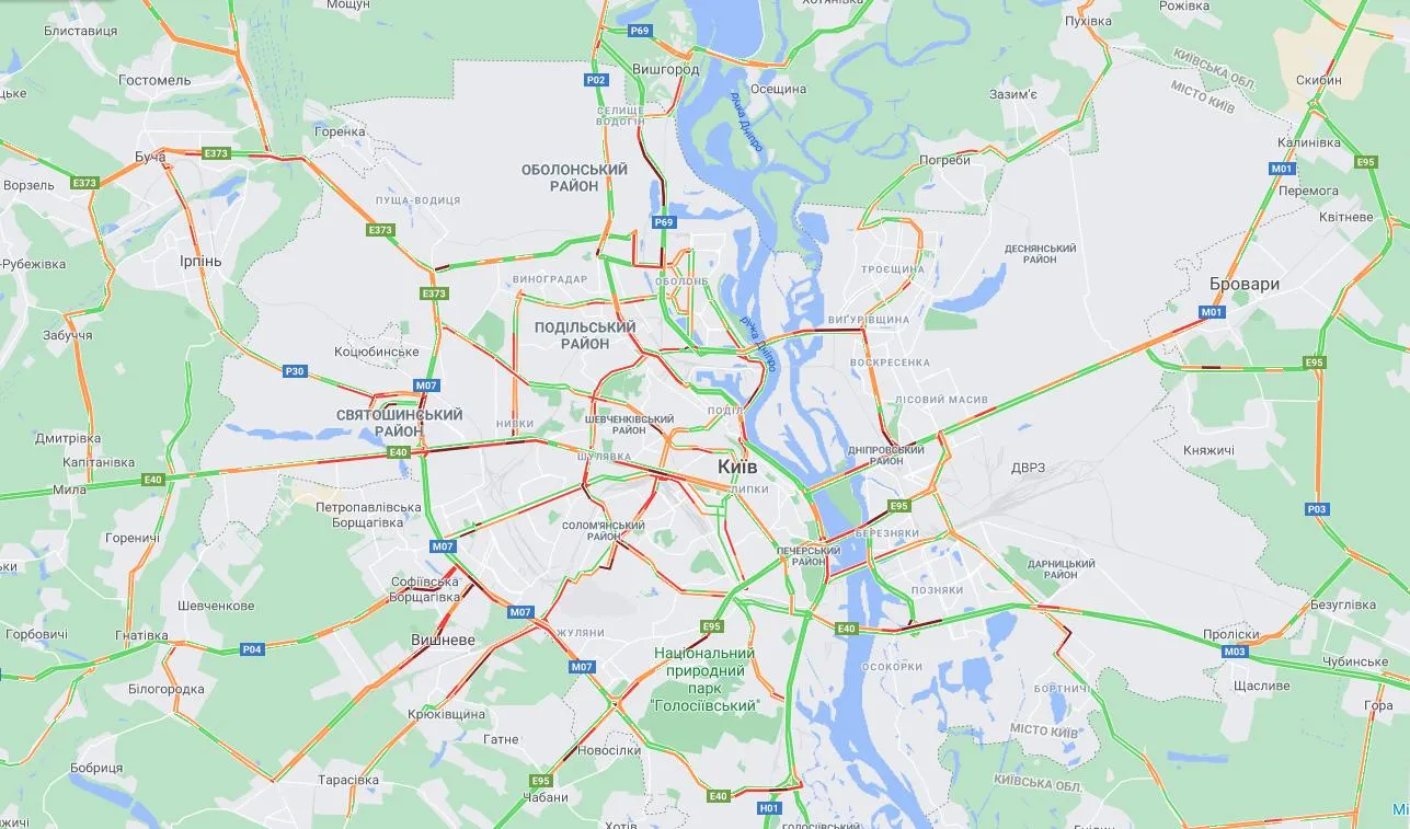 Фактично по всьому Правому берегу утворилися вкрай серйозні корки. Аналогічна ситуація спостерігається й на Лівому, однак там рівень заторів трошки менший. Крім цього, стоять автівки на всіх в'їздах до столиці.