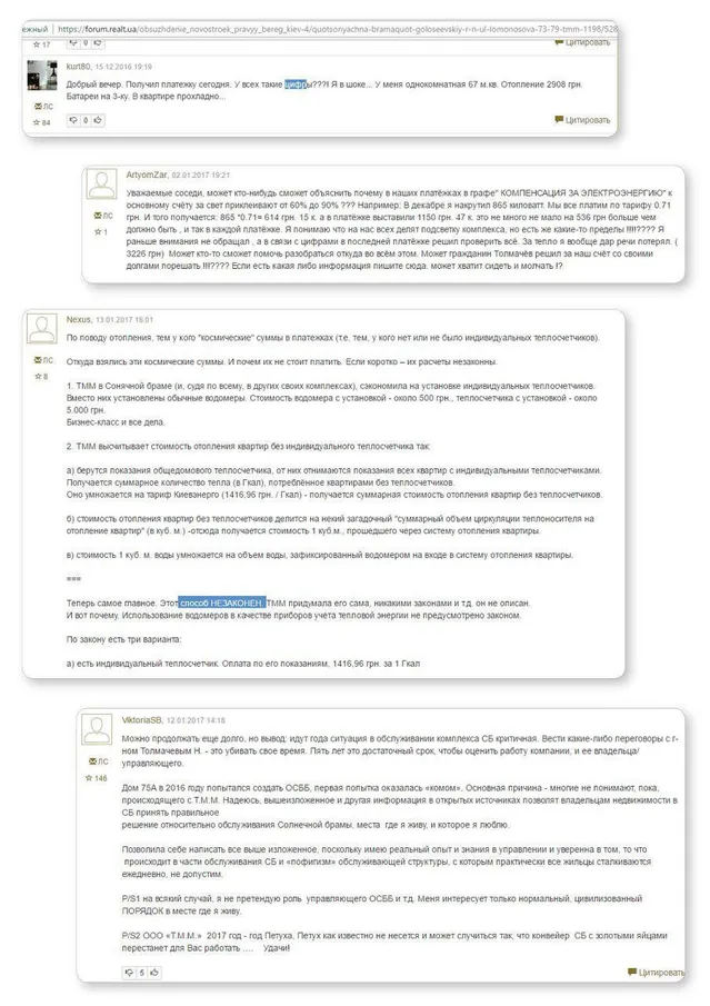 Учасники форуму звинувачують керуючу компанію в шахрайстві з метою завищення комунальних платежів. За словами одного з мешканців, ТММ проводить розрахунки з вимірювання нібито витраченої жителями теплової енергії за допомогою лічильників води.
