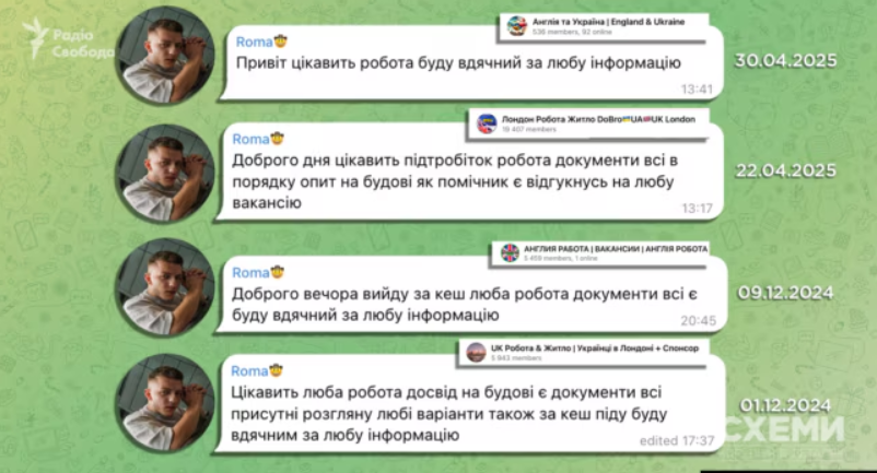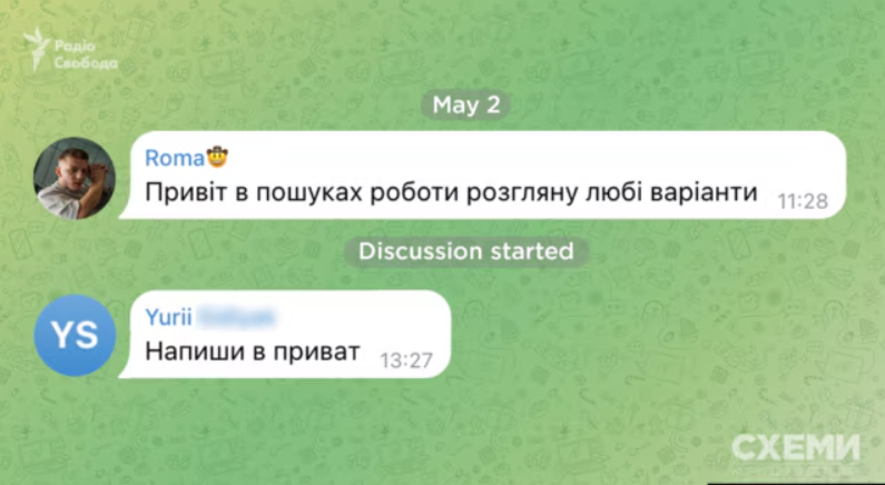 Так, 2 травня в групі "London UA" він написав: "У пошуках роботи розгляну любі варіанти". Через дві години на це повідомлення відповів користувач на ім'я Юрій: "Напиши в приват". Журналісти звернули увагу, що Юрій додався в "London UA" за декілька днів до цього діалогу.
