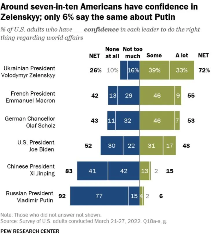 За даними PRC, зібраними 21 – 27 березня, 7 з 10 громадян Сполучених Штатів, або 72% респондентів, висловлюють довіру Володимиру Зеленському.