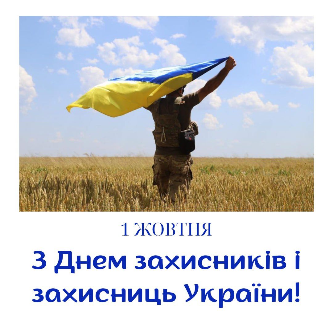 Вітаю з 1 жовтня – Днем захисників і захисниць України! Це – свято спадкоємності героїчних традицій нашого народу, сили духу і мужності, відданості своїй Батьківщині і гордості за її ратну славу. Від усієї душі бажаю вам доброго здоров'я на довгі роки, успіхів у праці, щастя, добробуту!