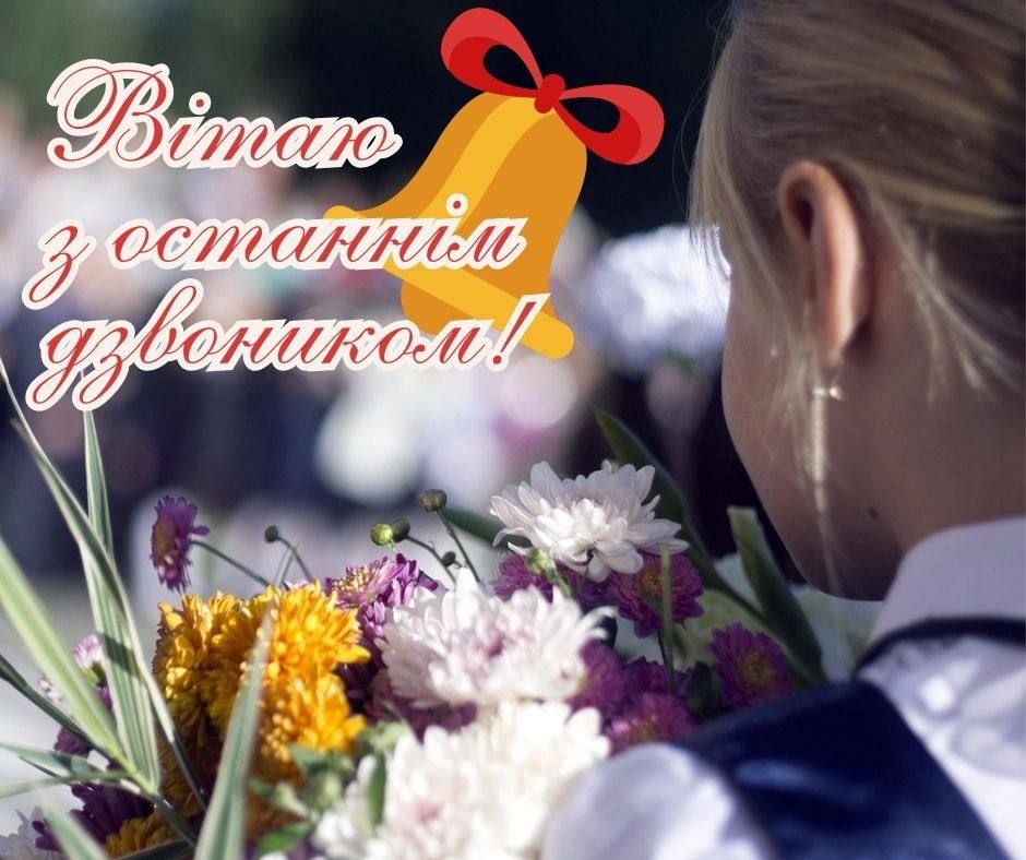 Щиро вітаю вас зі святом останнього дзвоника! Для багатьох школярів він сповіщає про чудовий відпочинок на канікулах, сповнений яскравих вражень. Тож бажаю вам гарно відпочити, набратися духовних і фізичних сил перед початком нового етапу навчання.