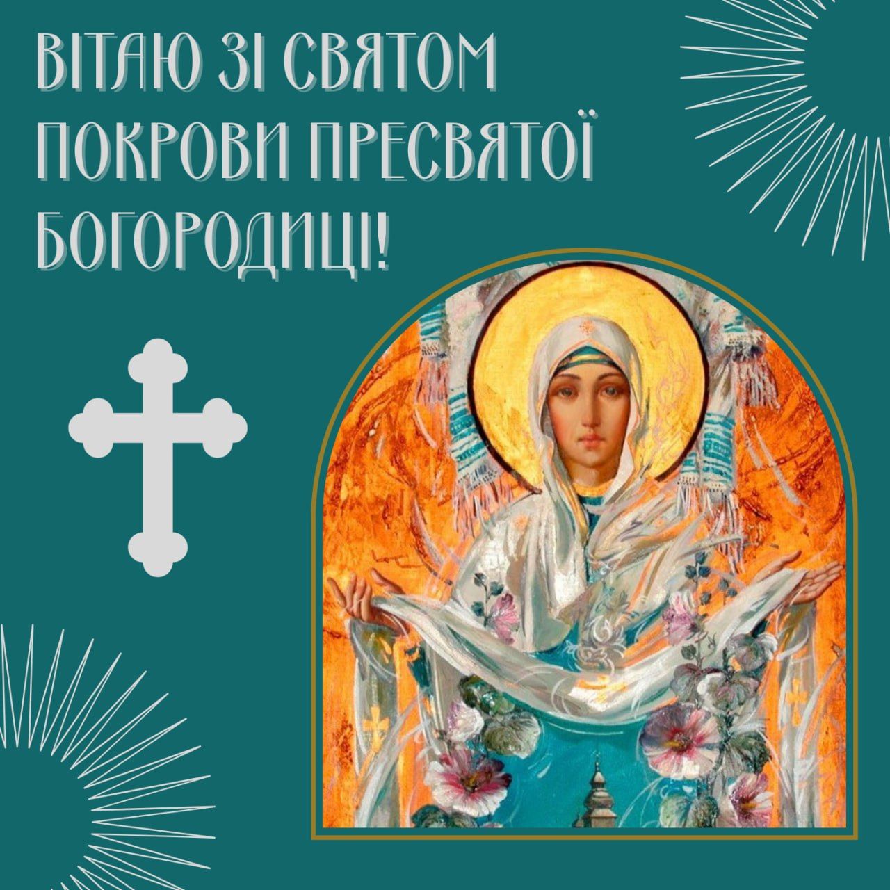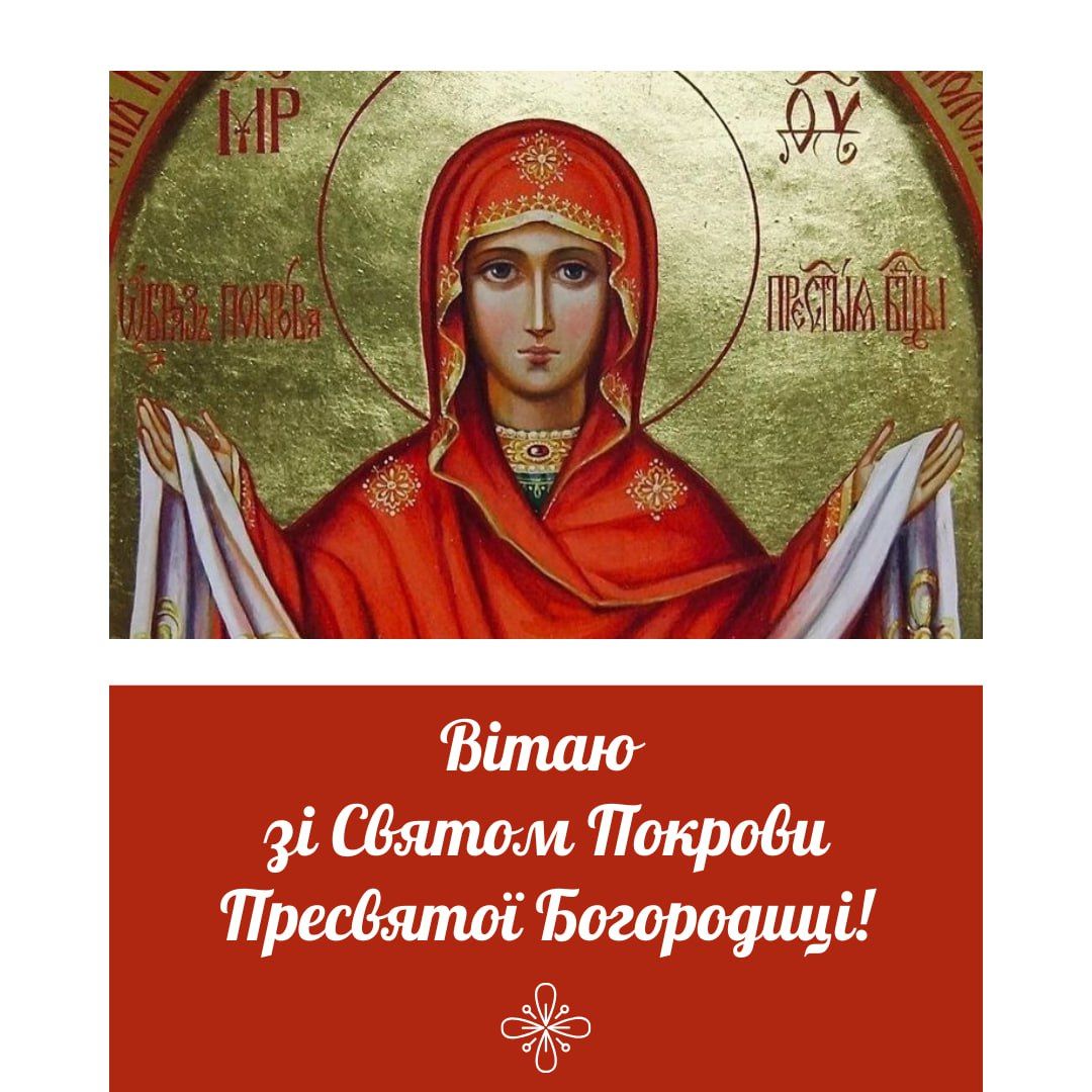 З нагоди святи Покрови Богородиці бажаю вам міцного здоров'я, великого родинного щастя, миру, взаєморозуміння, злагоди та добробуту. Нехай кожен день вашого життя буде сповнений радістю, теплом і новими здобутками, а ваші добрі справи примножать славу рідної України!