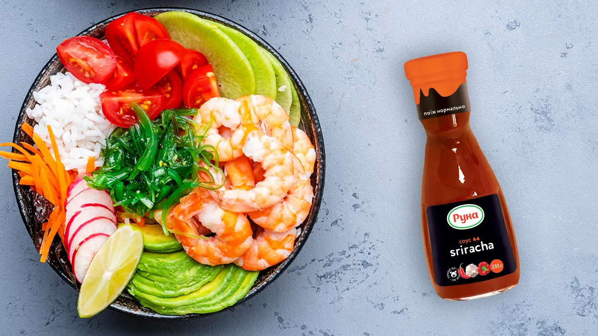 Блюдо почти готово! В глубокую тарелку насыпаем рис, с одной стороны выкладываем креветки, с другой – редис, помидоры, морковь, авокадо и ломтик лайма. Поливаем блюдо заправкой из имбиря и соусом Sriracha ТМ Руна. Именно этот соус украинского производителя сделает вкус блюда насыщенным и аутентичным.