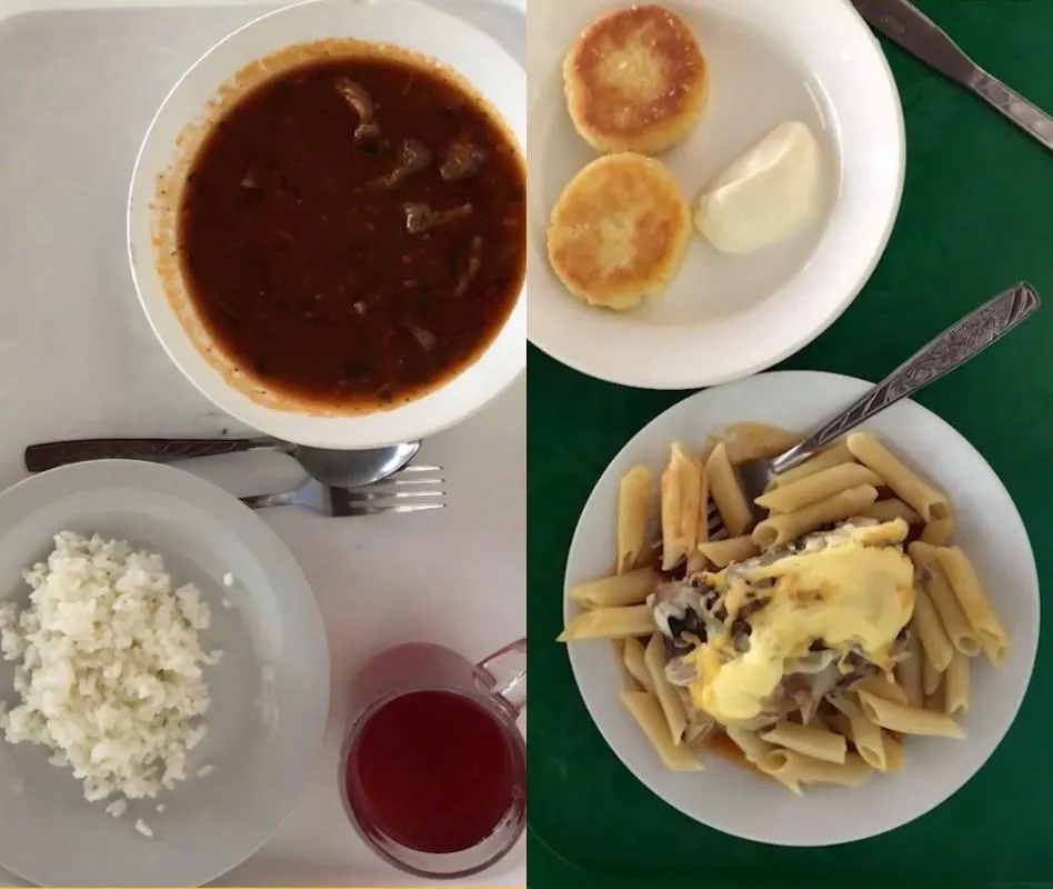 До прикладу, пів порція рису, солянки по-кавказьки, компот, м'ясо по-французьки з макаронами, сирники зі сметаною та кава обійдеться туристу у 560 рублів, тобто 240 гривень.