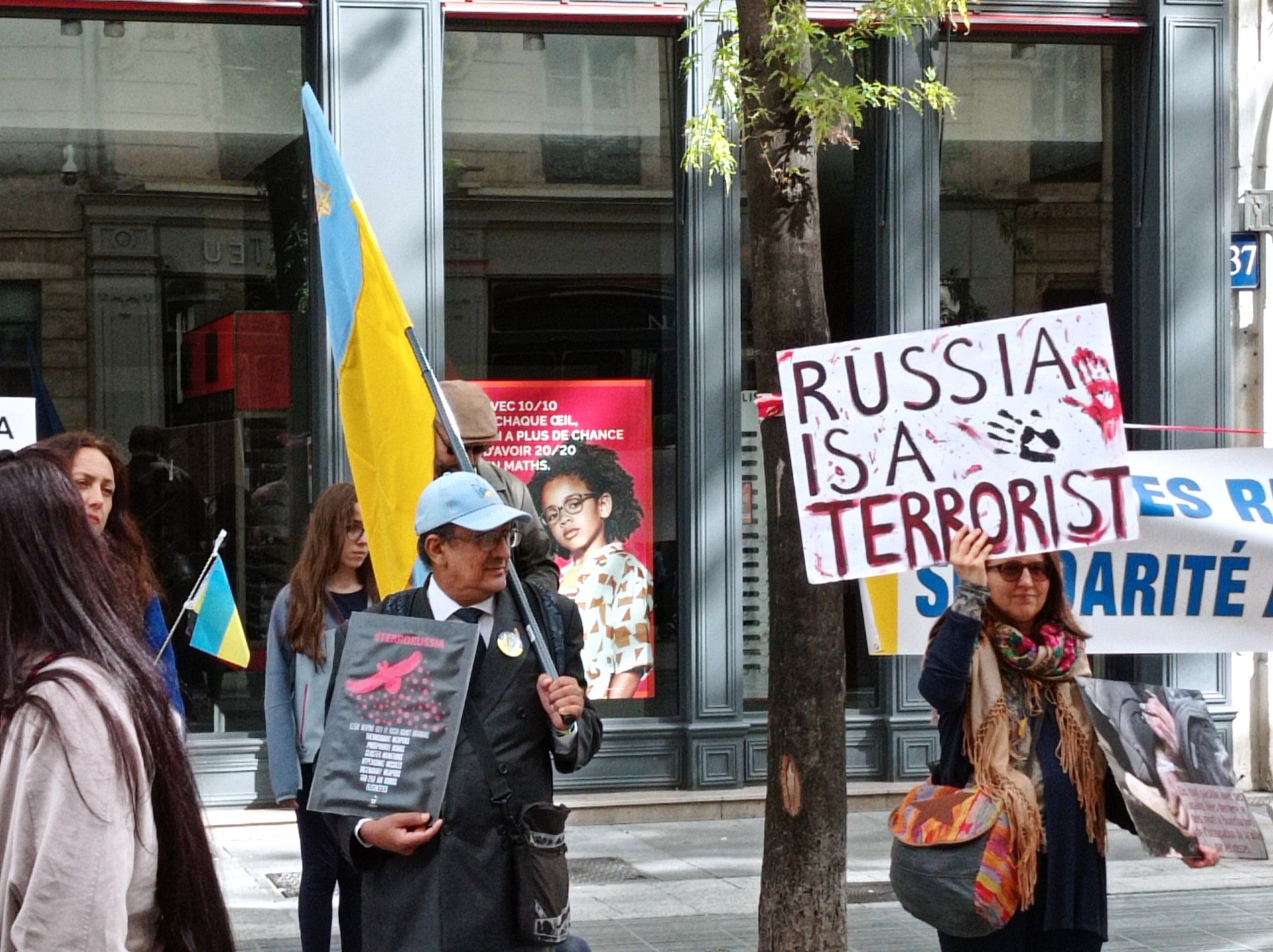 В акції взяли участь представники української діаспори й французи, які підтримують Україну і засуджують вторгнення росії та її воєнні злочини. Активісти тримали плакати, на яких було зазначено, що "росія – держава-терористка".