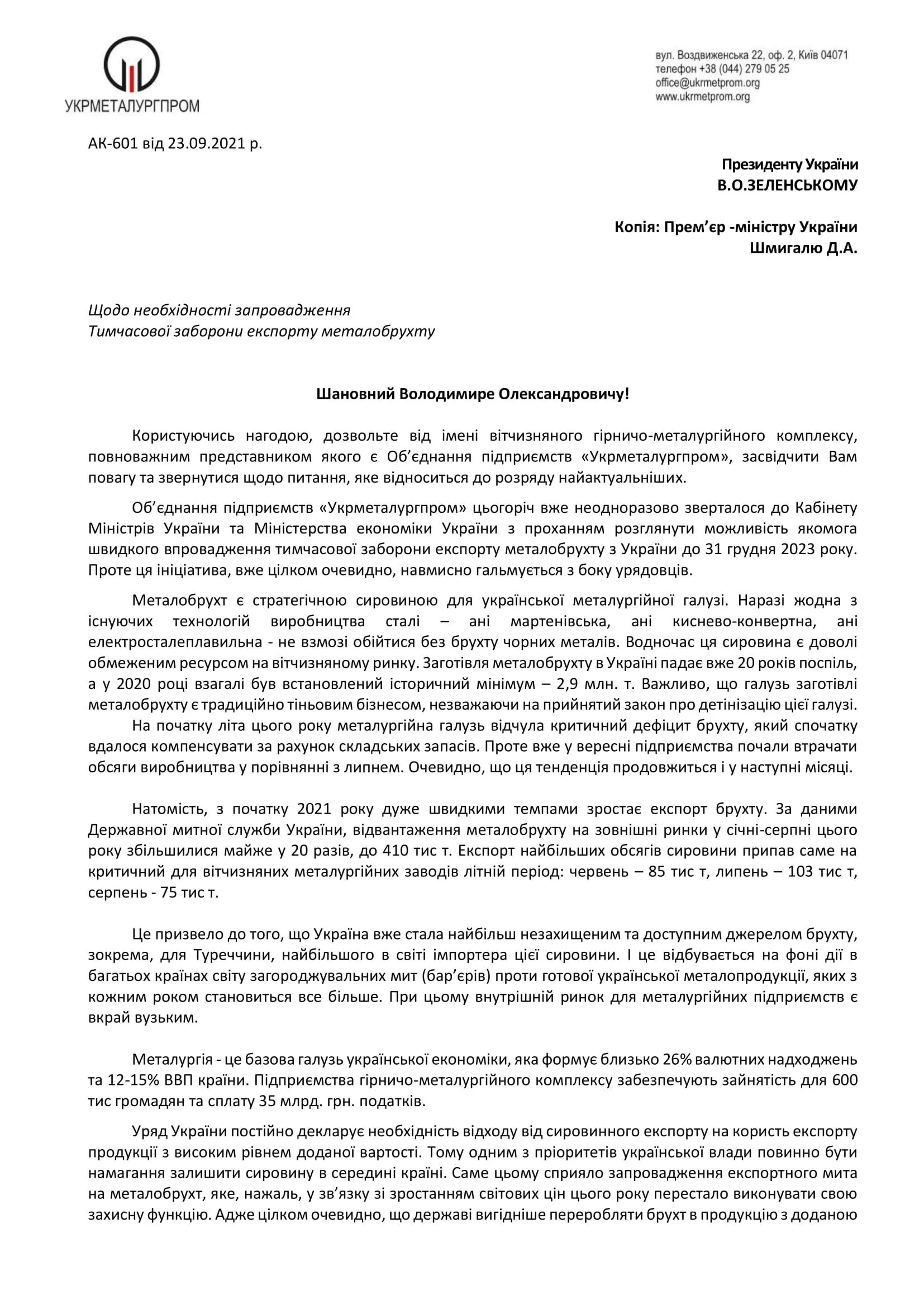 "З початку 2021 року швидкими темпами зростає експорт брухту. За даними Державної митної служби України, відвантаження металобрухту на зовнішні ринки в січні-серпні цього року збільшилися майже у 20 разів, до 410 тис. тонн", – йдеться в листі.