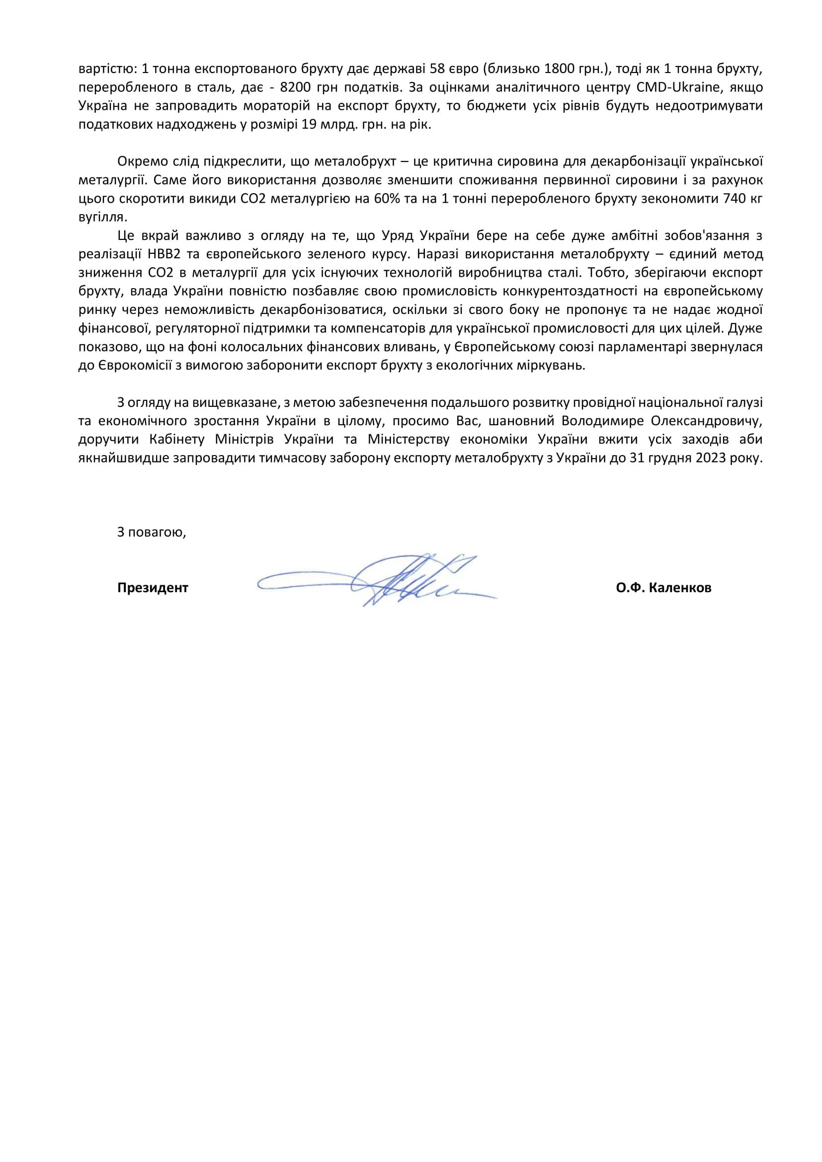 У листі Каленков нагадує, що металургія формує близько 26% валютних надходжень і 12–15% ВВП країни, а також забезпечує зайнятість для 600 тис. громадян та сплату 35 млрд грн податків.