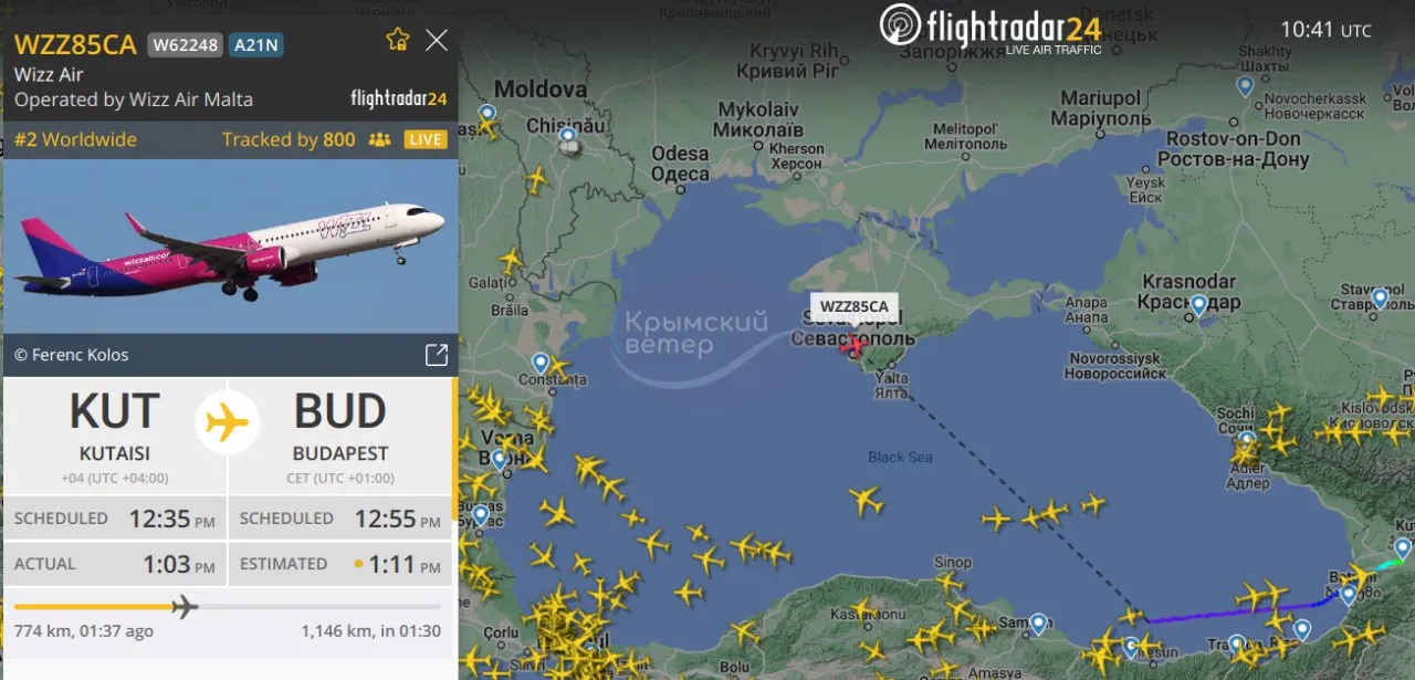 Дані свідчать, що літак летів з Кутаїсі в Будапешт. Моніторингові канали наголосили, що це точно збій, і літак не міг летіти з цим маршрутом. Останнім часом сервіс часто показує такі збої. Це після того, як російські загарбники почали глушити сигнали супутникової навігації в районі Криму.