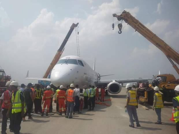 Інцидент стався з лайнером, який летів з Янгона в Мандалай. Після того, як пілотам не вдалося випустити передню стійку шасі, вони зробили 2 проходи на низькій висоті над злітно-посадковою смугою, відпрацювали пальне та успішно приземлилися без шасі.