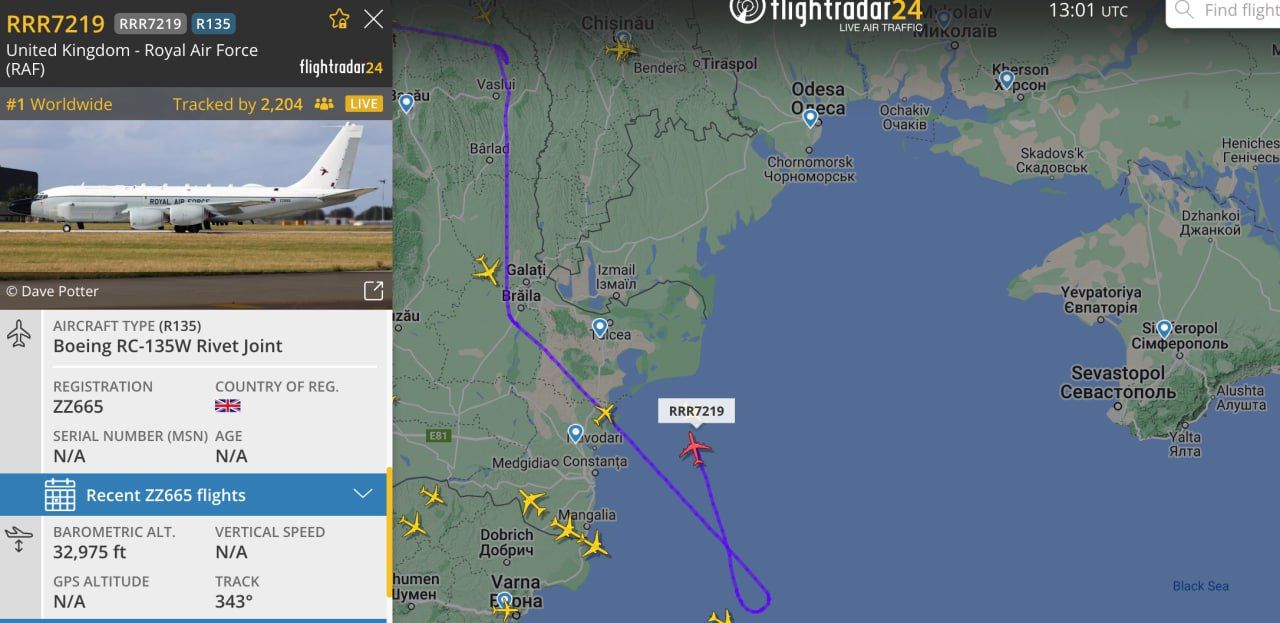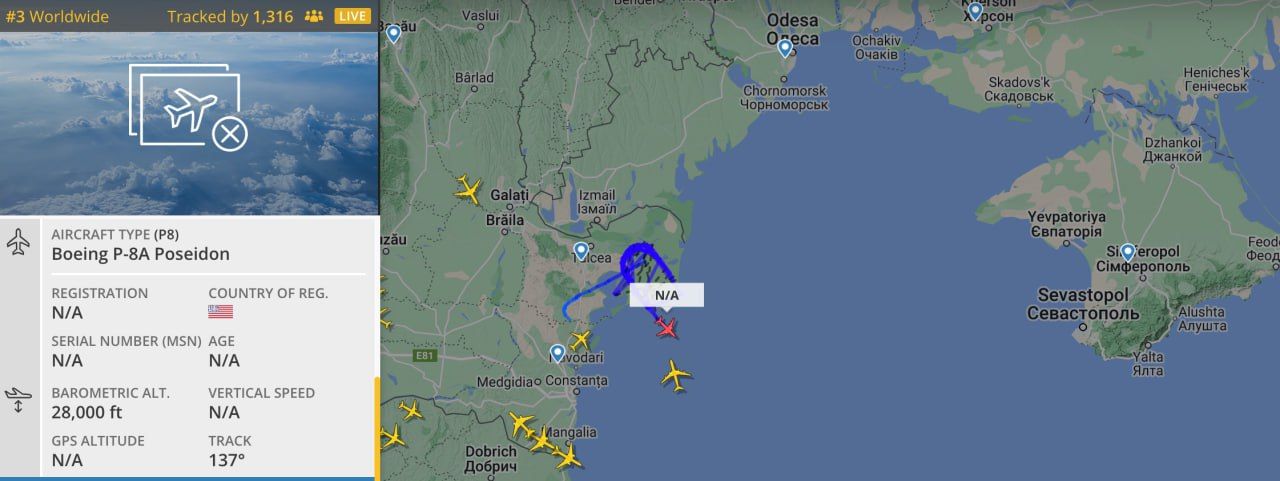 Сьогодні вдень біля узбережжя Чорного моря помітили 5 літаків НАТО. Про це повідомив портал відстеження авіаперельотів Flightradar.