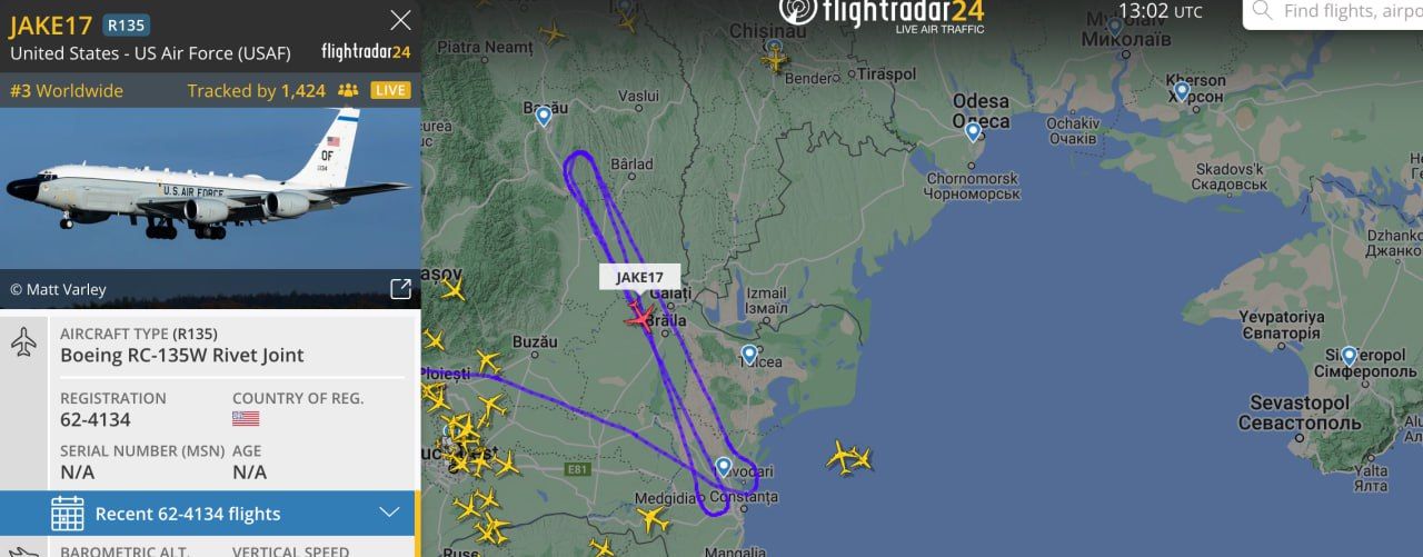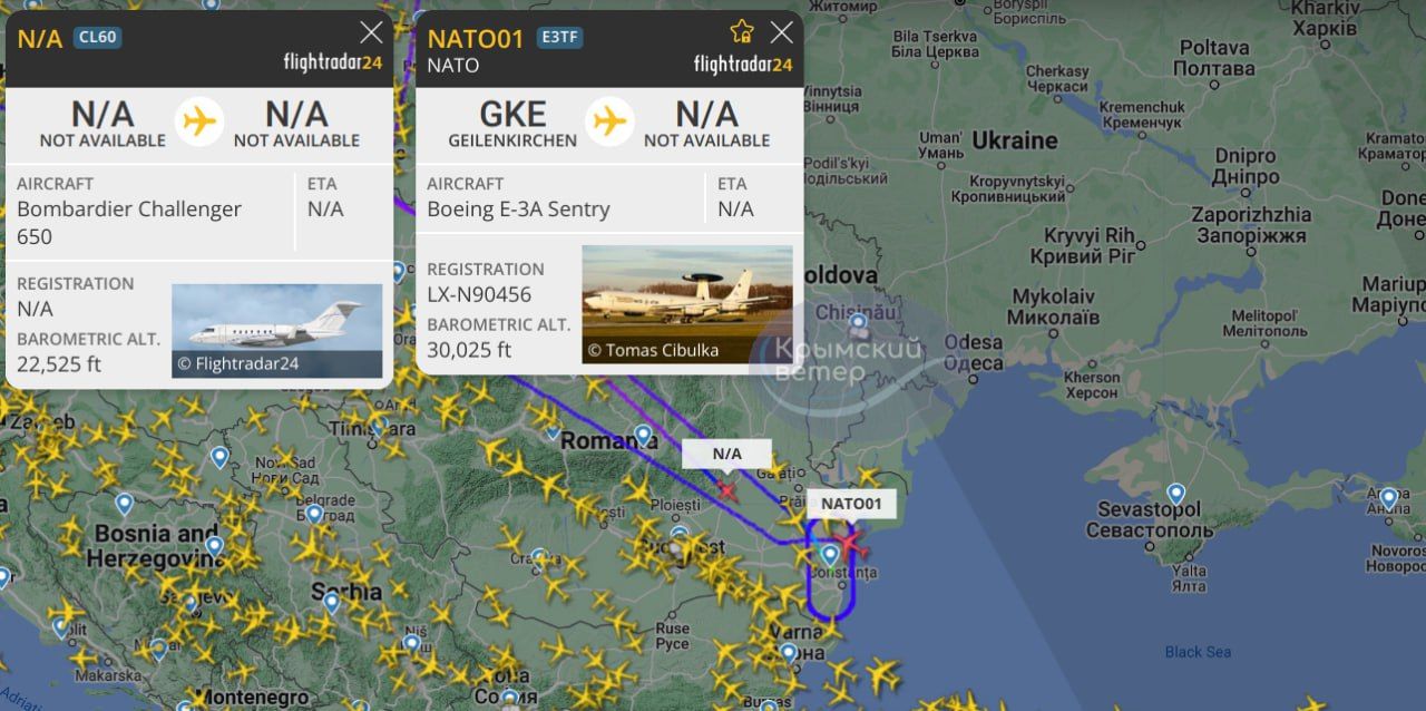 Так, один із літаків – Boeing E-3A Sentry – баражує над територією Румунії. Це американський літак далекого радіолокаційного виявлення та управління більш відомий як AWACS.