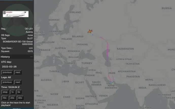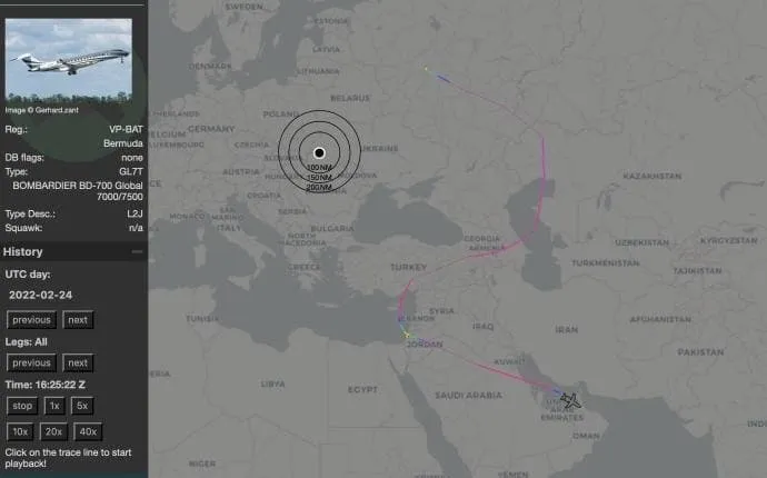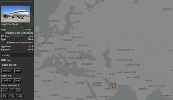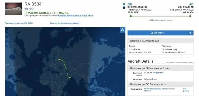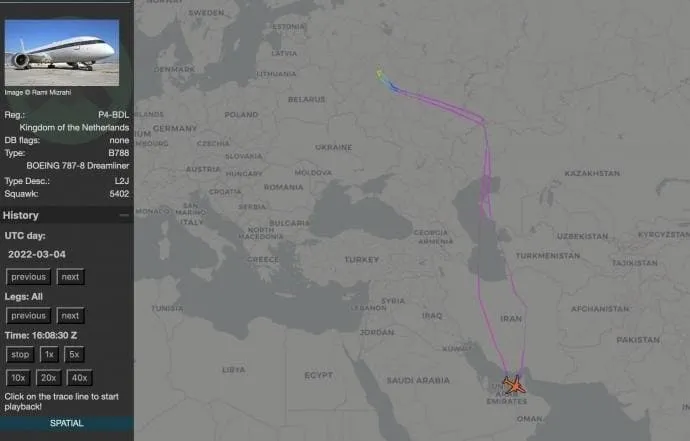 Борт Романа Абрамовича Boeing 787-8 Dreamliner протягом війни вже двічі літав у Дубай. Вперше вилетів з Москви 28 лютого, а повернувся 4 березня. Того ж дня знову вилетів.