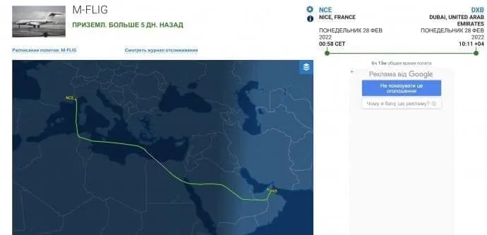 Другий політ літака Абрамовича в Дубай / Карта SPRAVDI
