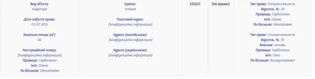 Про це свідчить декларація дружини. Як повідомляє Вihus.info, площа квартири 85 квадратних метри. Право власності на неї у Горбатенків виникло 2 липня 2015 року. Суддя зазначив, що її вартість на момент придбання була 235 тисяч гривень. Відтак, квадратний метр квартири мав би коштувати лише 100 євро.