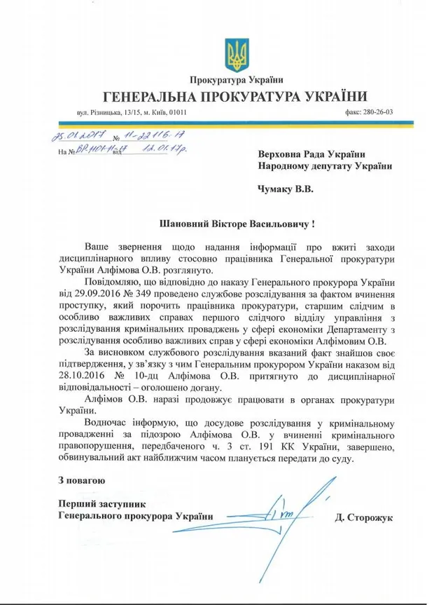 У відповіді ГПУ зазначається, що Олексію Алфімову оголосили догану після завершення службового розслідування.