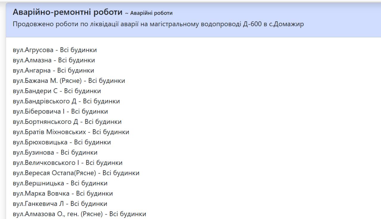 22 жовтня повідомлялось, що через аварію на магістральному водопроводі у Домажирі водопостачання частково призупиняли з 05:00 23 жовтня та до кінця дня у Шевченківському, Залізничному та Франківському районах.