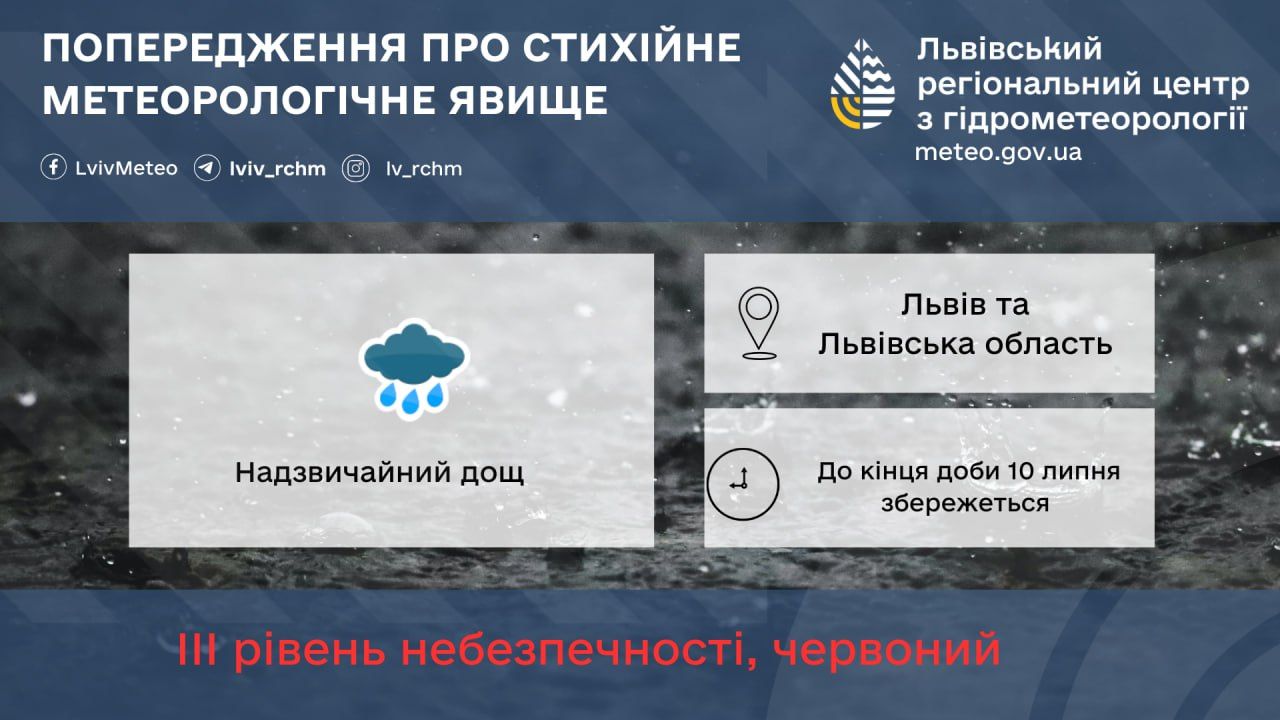 - У Львові оголошено ІІІ рівень небезпеки через інтенсивний дощ, який триватиме до кінця доби 10 липня.
