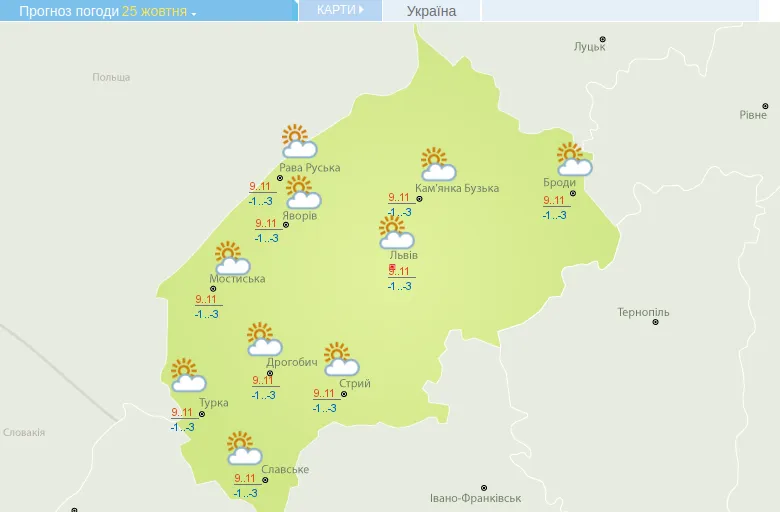 Прогноз погоди на 25 жовтня / Дані Укргідрометцентру