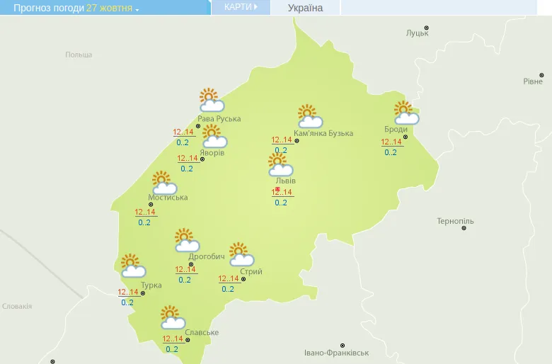 У середу, 27 жовтня, як і в усі попередні дні, на Львівщині буде хмарно з проясненнями. Опадів не прогнозують.