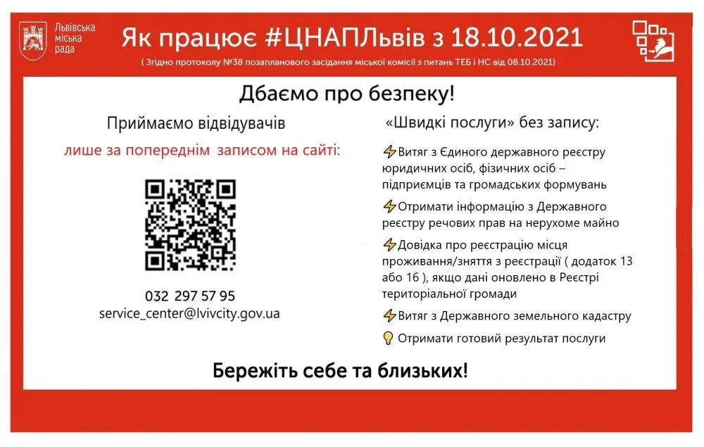 Керівниця департаменту адміністративних послуг ЛМР Валентина Бартошик розповіла, що у ЦНАПах важливо облаштувати максимально безпечні умови для відвідувачів у період посилення карантину. Тож, щоб уникнути скупчень людей, відвідування центрів з 18 жовтня відбуватиметься лише за попереднім записом.
