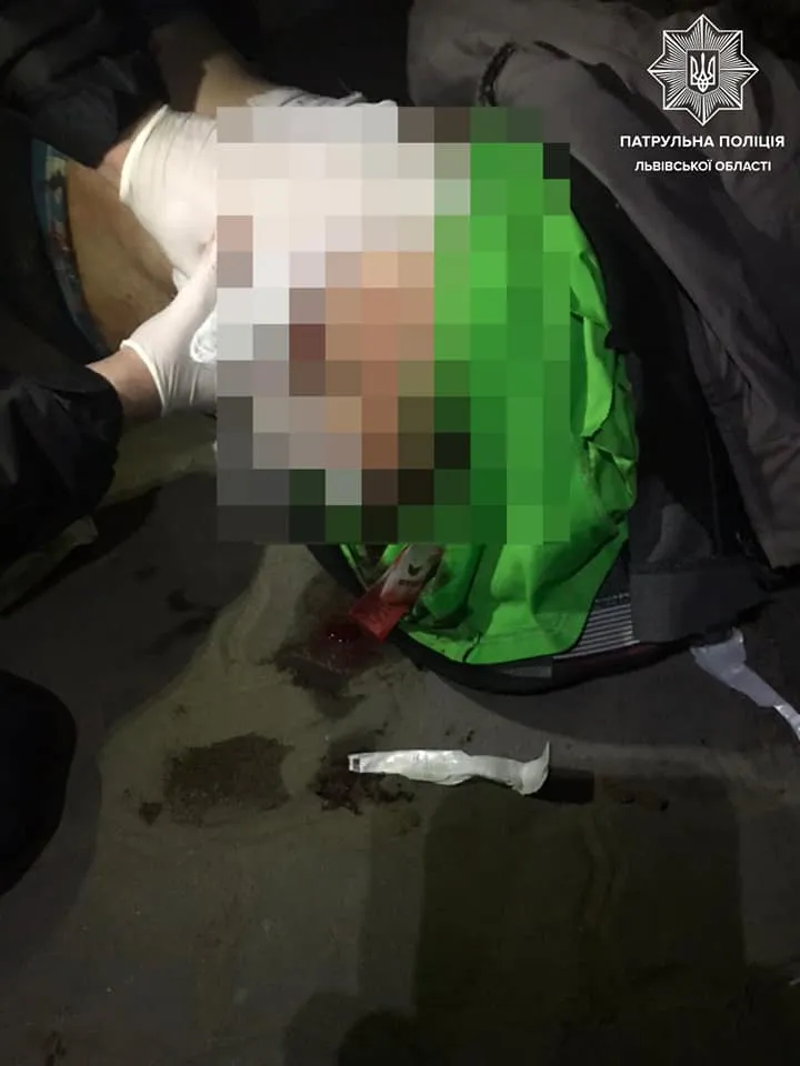 - Поранений чоловік лежав на землі. Один з патрульних одягнув рукавички, розрізав одяг постраждалого та затиснув ножову рану на спині, з якої сильно текла кров.