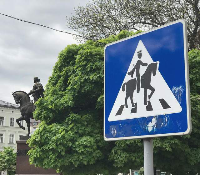 Дорожные знаки обновили не кое-как – наклейки наклеили тематически. Возле памятника Даниилу Галицкому появился знак с пешеходом на коне, а возле кукольного театра – с пешеходом-марионеткой.