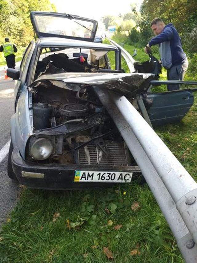 Отбойник прошел через капот как раз на водительском месте и пронзил машину насквозь. К счастью водитель выжил. Его с травмами различной степени тяжести госпитализировали в Мостискую ЦРБ.
