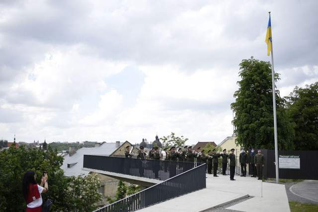 Он торжественно поднял национальный флаг над Мемориалом памяти Героев Небесной Сотни. К этому церемониалу присоединились и духовой оркестр и знаменосная группа военной части №3002.