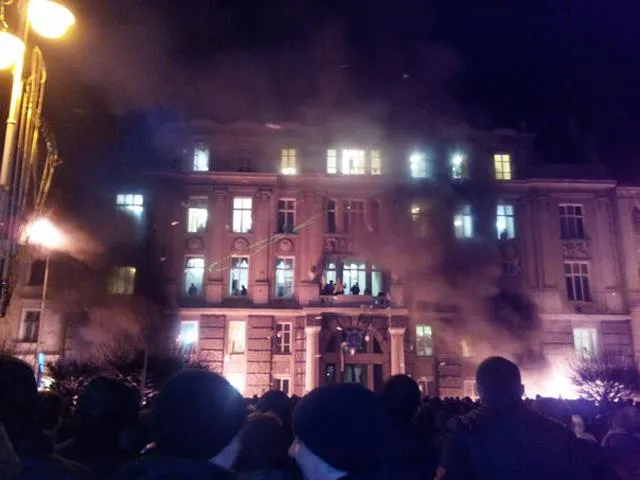 Біля центрального входу прокуратури активісти розпалили багаття, очевидно, з паперів, які винесли з кабінетів будівлі.