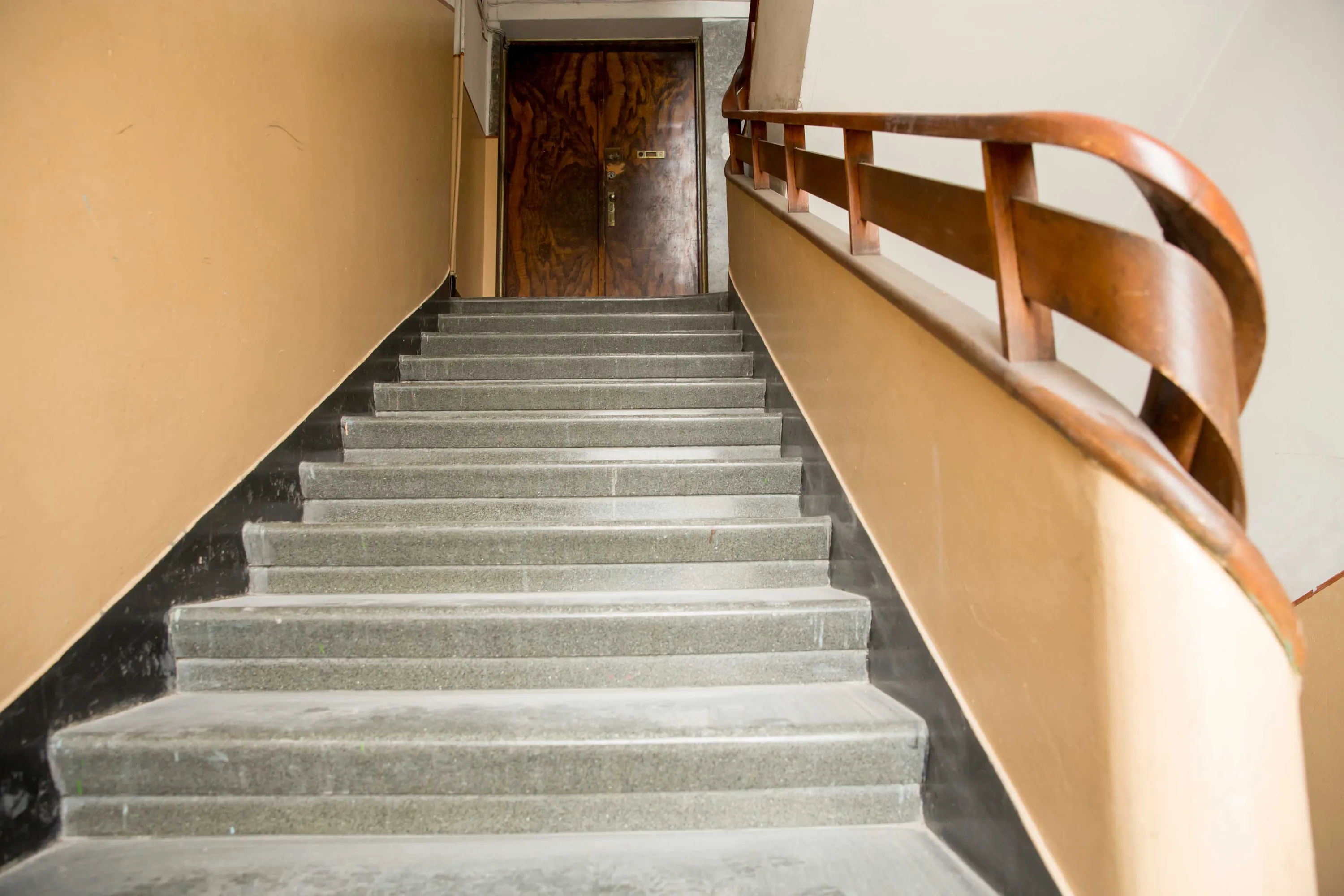 Сходовий марш суцільно литий з поручнями. Каслер саме впізнається в поручнях, в його будинках вони завжди особливої форми – гострі геометричні кути поєднуються з гнутими формами. Особливо на згинах між поверхами – перила ніби перетікають знизу доверху і навпаки. Тут дуже чітко проглядається інтуїтивний, чуттєвий дизайн міжвоєнного модернізму.