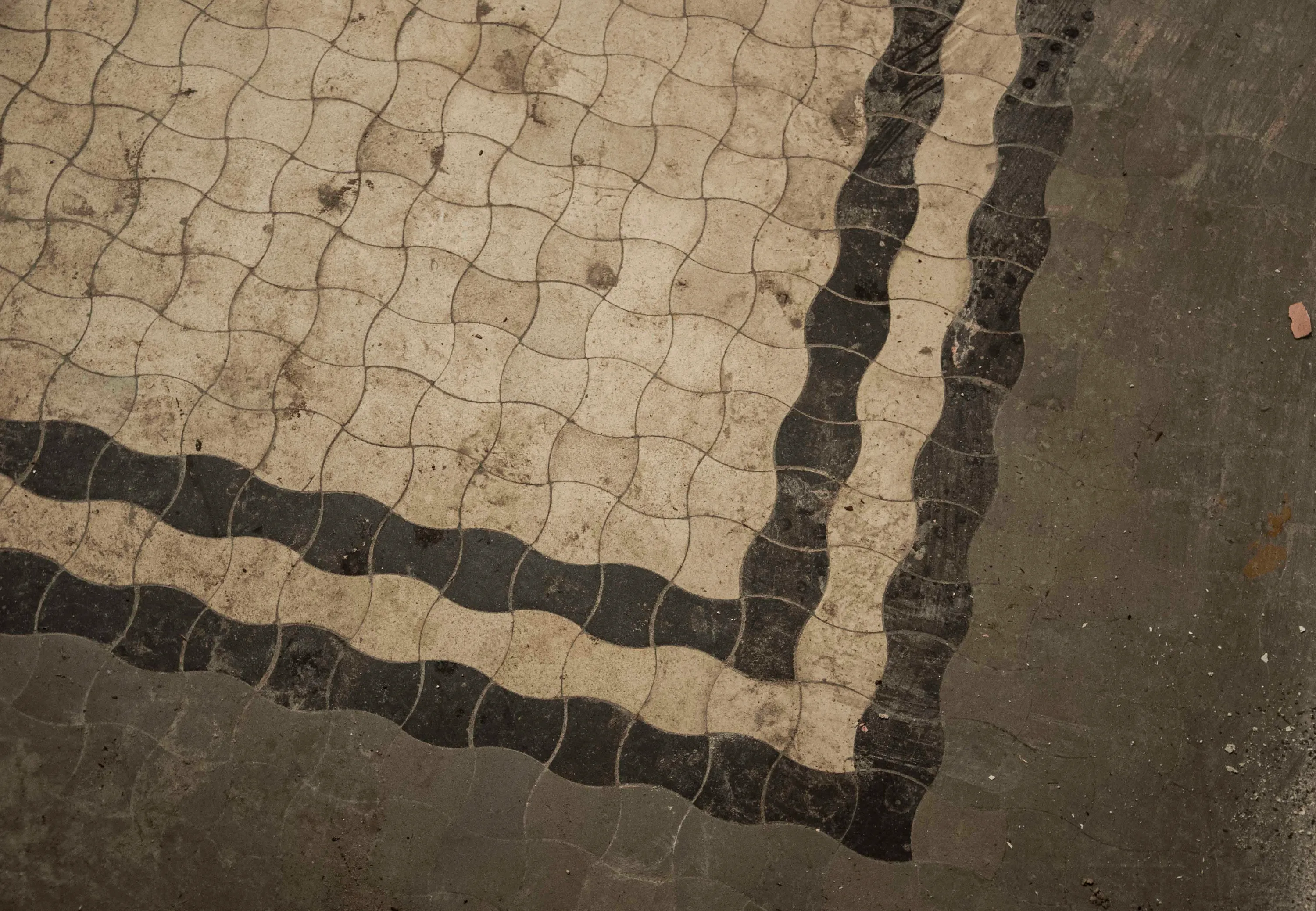 Підлога викладена узорами з чорно-білої плитки, але архітектоніку порушили при ремонті – іншою різнорідною плиткою та асфальтуванням.