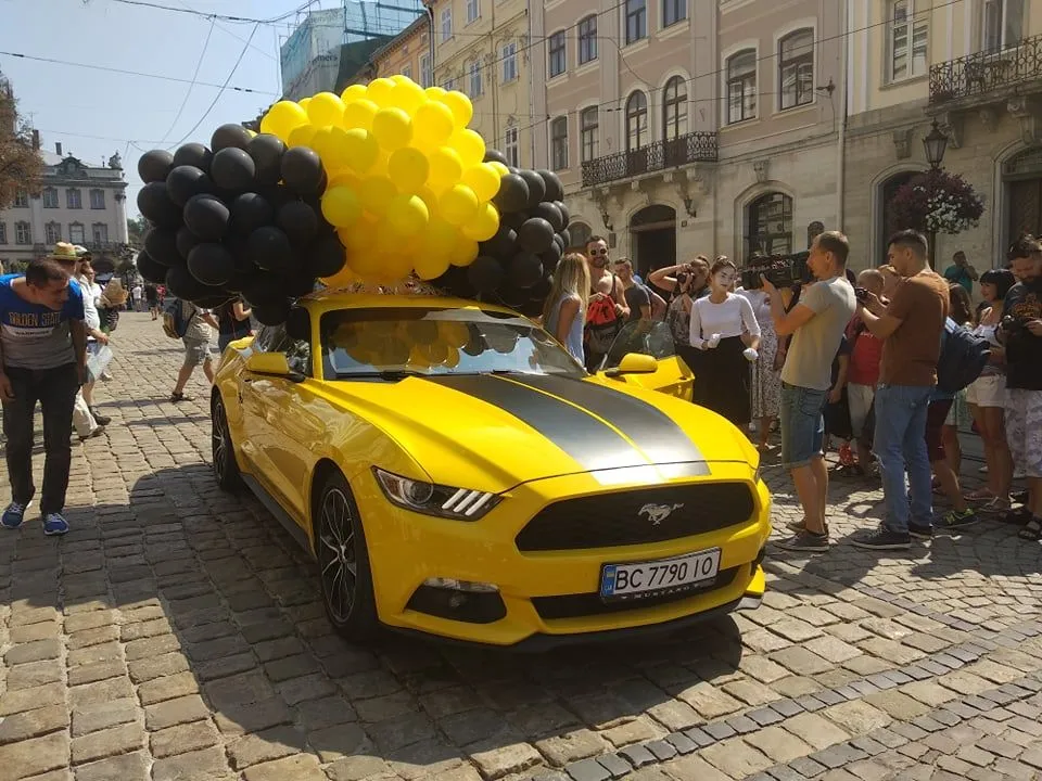 Свою кохану Михайло повільно підвів до трансформера Bumblebee і все почалося. За хвилину підбігли міми, які зненацька закрили Анастасії очі та завели до головного подарунка. Це спортивний Ford Mustang чорно-жовтого кольору.
