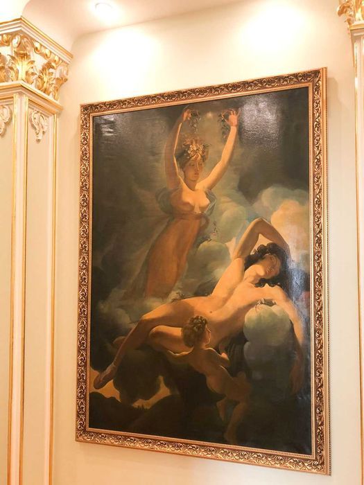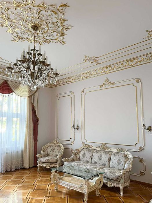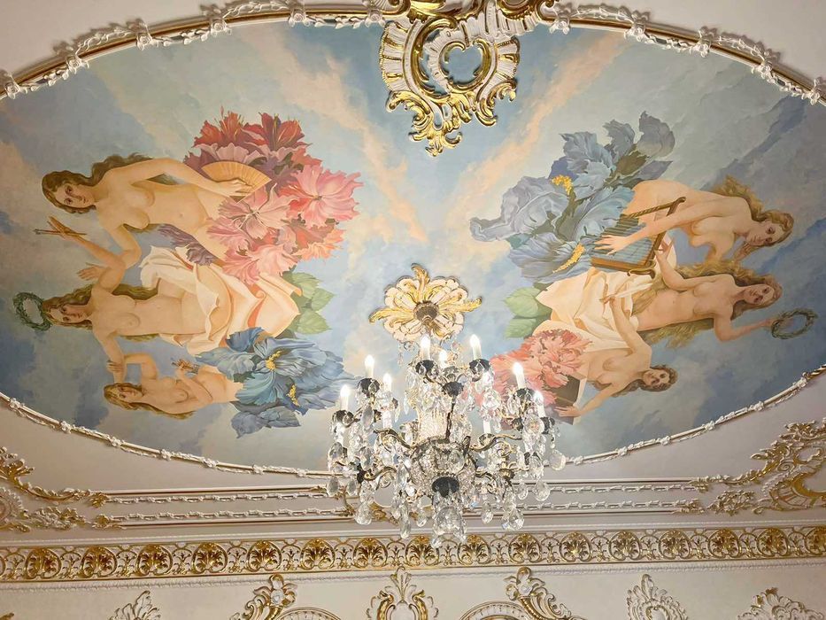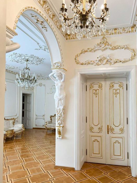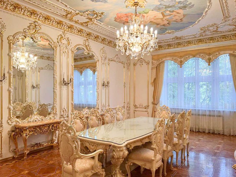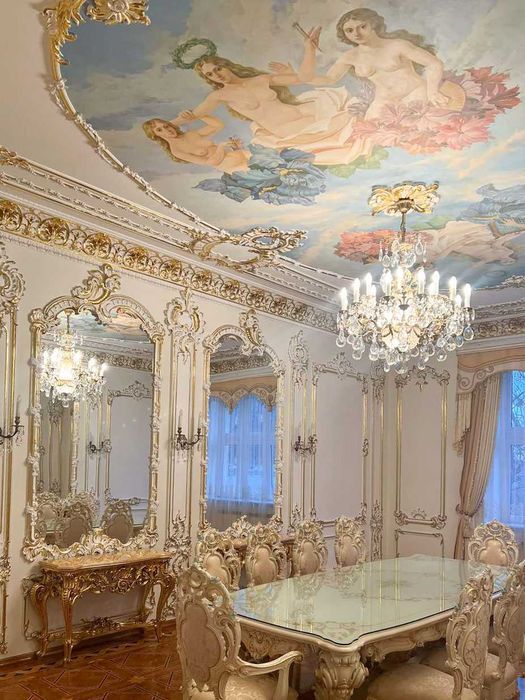 На фото можна побачити, що стелі кімнат розписані малюнками та оздоблені гіпсовою ліпниною з позолотою, стіни обвішані великими дзеркалами, а зі стель звисають масивні кришталеві люстри. Також квартира оздоблена масивними меблями в стилі бароко.