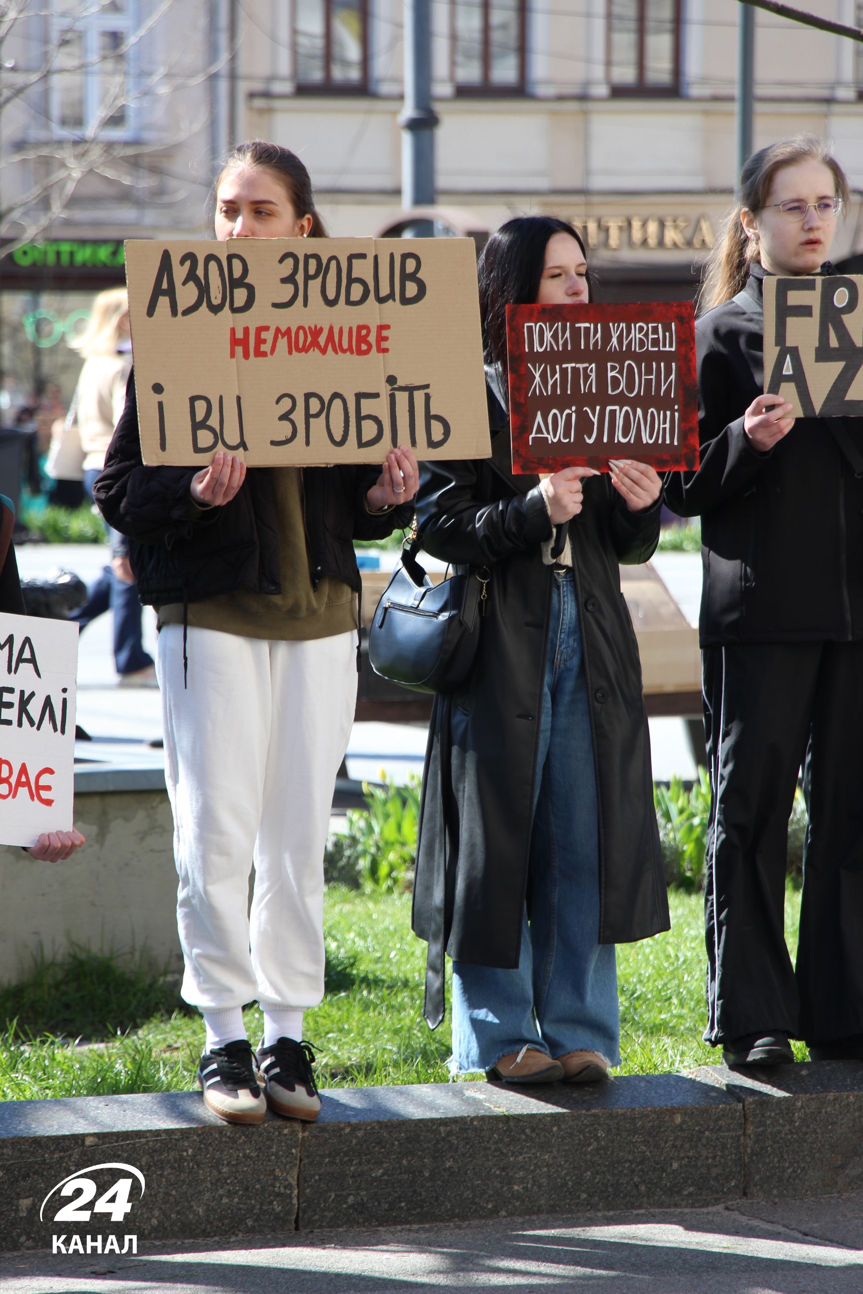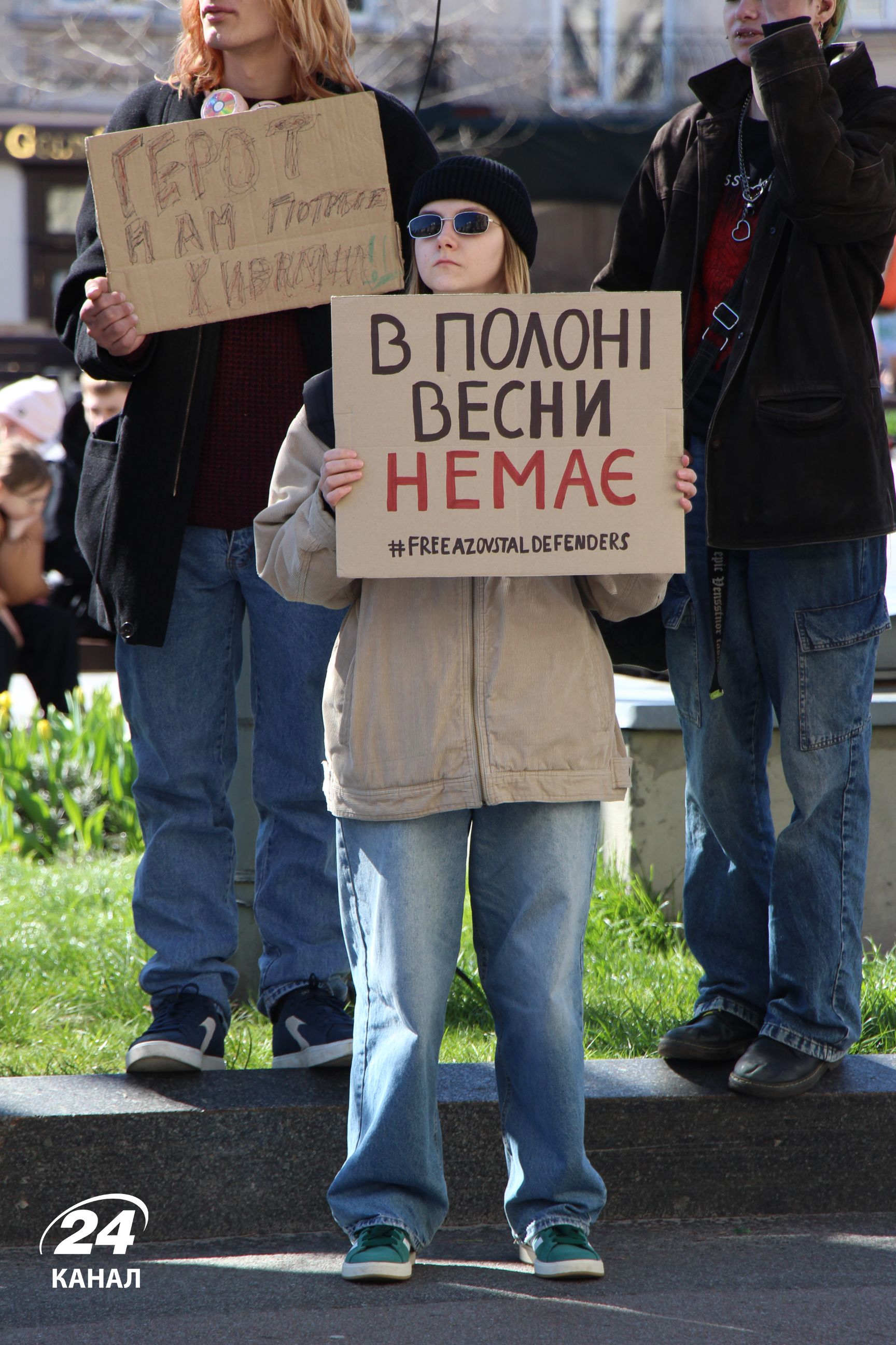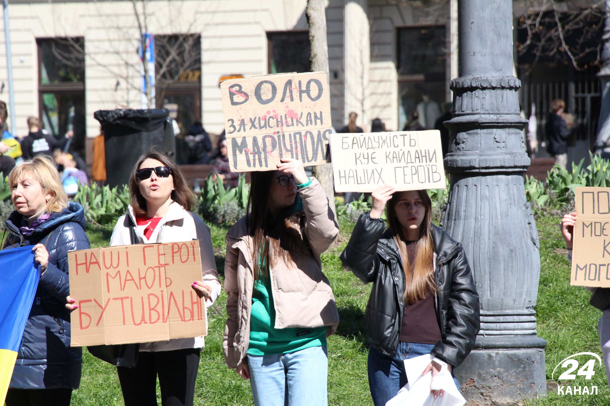 На численних плакатах було написано: "Волю захисникам Маріуполя", "Наші Герої мають бути вільними", "Я голос полонених – а ти", "В полоні немає весни" тощо.