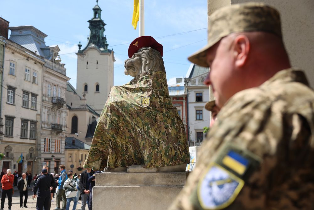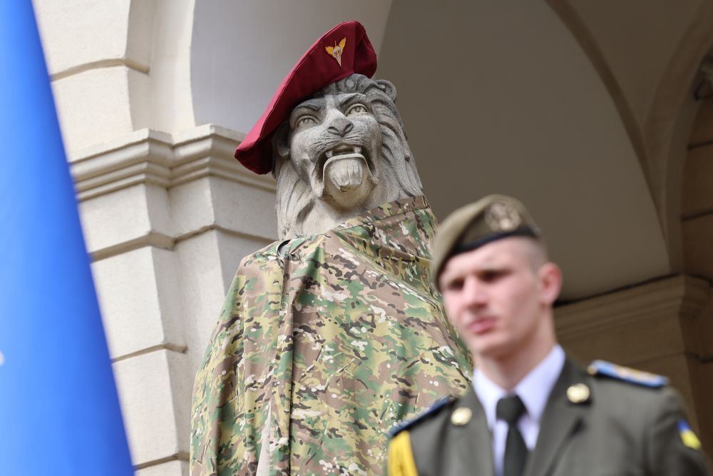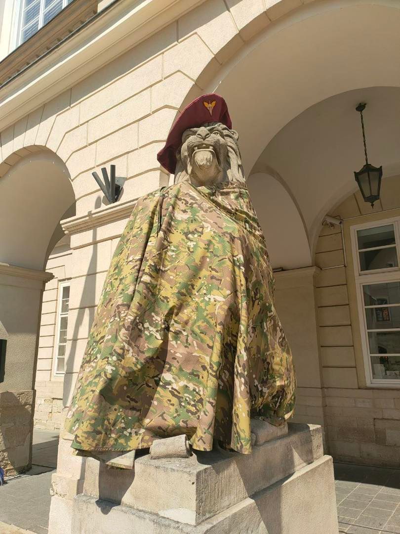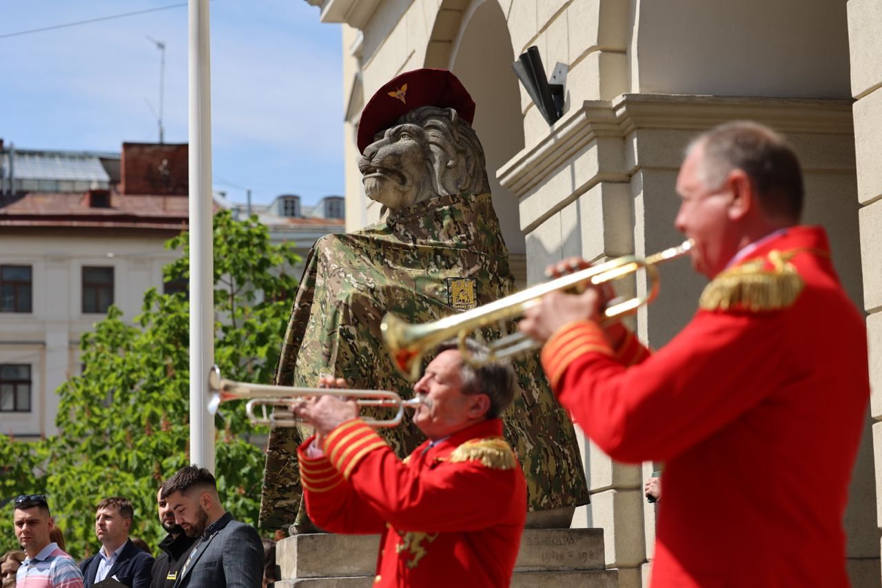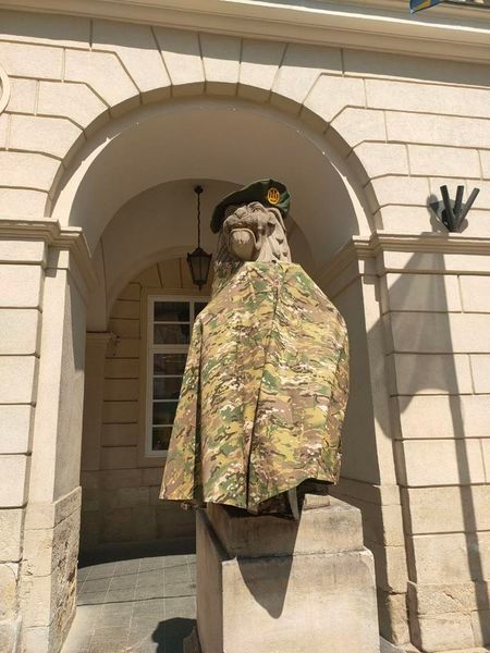 Окрім того, левів біля Ратуші також вдягнули у військову форму. Це відбулось вперше в історії міста. В управлінні внутрішньої політики Львівської міської ради пояснили, що це символічний жест, адже в цей день акцентували на подяці нашим захисникам за те, що виборюють свободу для України та Львова зокрема.